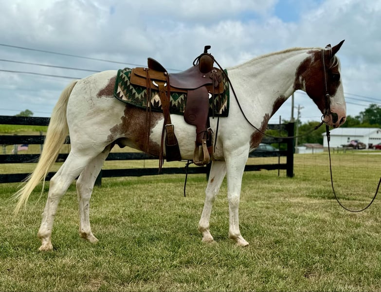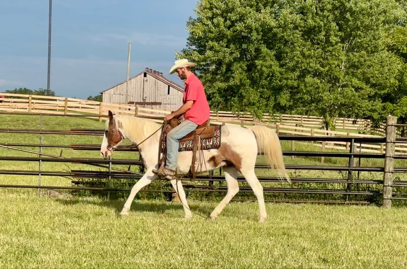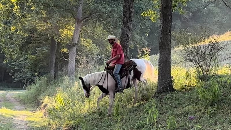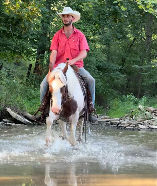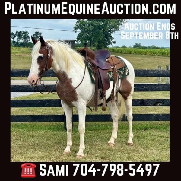 ONLINE AUCTION Place your bids at www.PlatinumEquineAuction.com Starting Bid $3500 Auction ends September 8th, 2024 Need a new saddle? Check out White Rock Saddles on our website or Facebook! Fritz is an eye catching bay roan and white pinto gelding. He is 10 years old and stands 14.3 hands. He is a very stocky and stout made gelding! If you’re looking for a laid back gelding to hit the trails with or to do some light arena work, Fritz is your man! He rides out alone or with a group. He is a very experienced trail riding horse. He will step quietly over logs, he drops down hills easily, and will walk over a ditch like a gentleman. Fritz is not a spooky gelding. He is not frazzled easily, even if younger or less experienced horses get worried over something. He stands nicely when it’s time to take a snack break on the trail. He walks, jogs, and lopes well. Fritz stands grooming, saddling, and mounting. He trailers well and handles new places with grace. Fritz is traffic safe. He is quiet and gentle enough for all levels of riders! If you just want to jump on and have fun bareback with a halter and lead rope, he is comfortable to do that too. In addition to riding, Fritz has been driven to the wagon as a team. He will stand to harness and hook with no issues! His quiet demeanor is hard to find, and that’s what we love the most about him! For more information, please call Sammi Waugh 704-798-5497. Located in Brooksville, KY. ONLINE AUCTION Place your bids at www.PlatinumEquineAuction.com Starting Bid $3500 Auction ends September 8th, 2024 Need a new saddle? Check out White Rock Saddles on our website or Facebook!