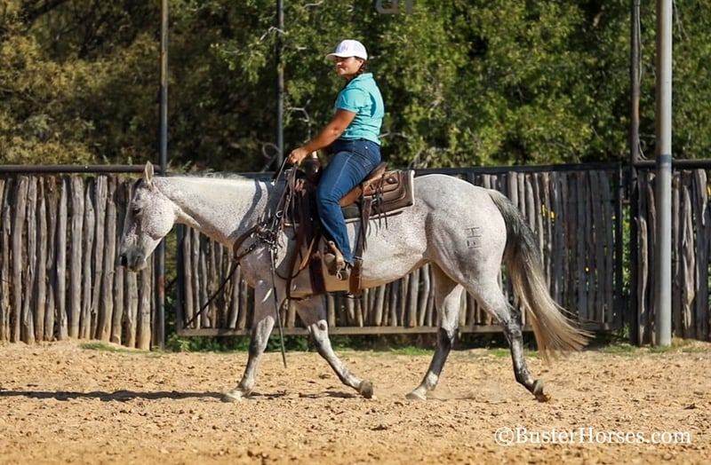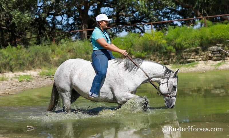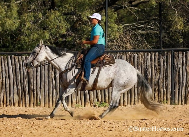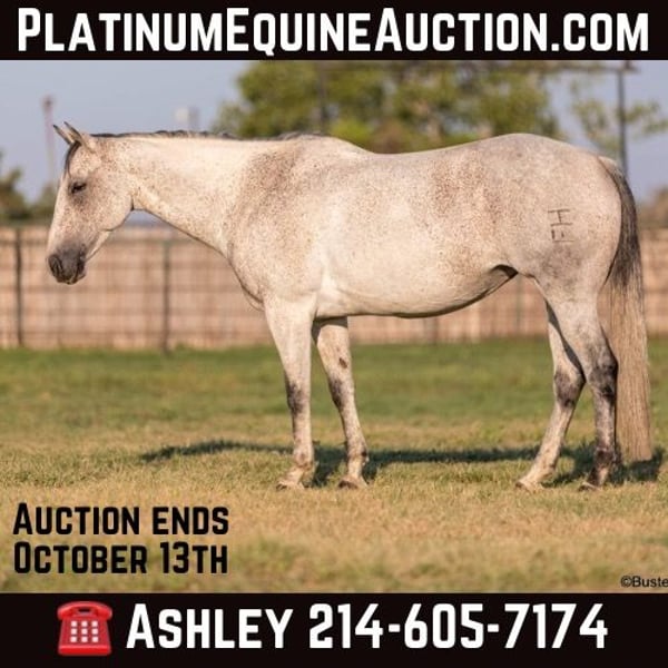 ONLINE AUCTION Place your bids at www.PlatinumEquineAuction.com Starting Bid $3500 Auction ends October 13th, 2024 Need a new saddle? Check out White Rock Saddles on our website or Facebook! “Mary Lynn” – 15H, 12 year old gray grade quarter horse mare. “Mary Lynn” is one of the most versatile, true all-around horses we have had in a long time! Amazing family horse, pleasure horse, trail horse or first horse. This one could get you started in literally ALL OF IT – would be great for the lower level dressage, Pony Club, Hunter/Jumper shows, but and also take a young rider to the 4-H shows, compete in the ranch riding and Ranch versatility competitions, trail horse competitions, play days, speed events, drill team, queens competitions, and even rope off of her! Mary Lynn is absolutely pleasant, all business, zero non-sense whatsoever….but still very personable, sweet, kind, great natured, and enjoyable to be around. She is smooth and pleasant to ride anywhere, every single step of the way. She has good cadence, and carries herself very naturally and easily. Comfy to just sit on, uncomplicated – just point wherever you want and she goes there. Smooth gaited and one of the favorite ones that all the kids fight over riding. She absolutely loves the water… as in you almost have to be a little careful riding around water, or walking up to grab a drink – because she will definitely encourage you to just go get in it, if she is given the chance! She hops right on the trailer like a seasoned good old Ranch gelding, and she hauls and rides out just as confidently alone as she does in a group. She catches both leads easily, and has a great stop on whoa. Very consistent, solid, and honest – can pull her bridle off and she’ll go anywhere that you point her with just a little nudge across her neck. She is always happy to stop, great brakes on “Whoa”, but willing to go to work and doesn’t make you ask 17 times before she gives you a trot or a nice little hobby horse lope. Easy to get along with in all ways, great ground manners, happy kept up in the barn, happy outside and gets along really well in a group of horses, easy to turn out with anyone. She comes right up to you to be caught and loves to have attention. If you were looking one to just enjoy riding, don’t look past Mary Lynn. To see additional videos, go to our website: BusterHorses.com or our Facebook page Buster Horses. Check our website for buyer reviews, more videos, additional info: etc: https://busterhorses.comMary_Lynn Mary Lynn was just shod this week, her teeth were also done by an equine dentist, she had her ears preemptively treated for ticks, and she was also power packed wormed. She is good to shoe, has great feet and also goes well barefoot – if her new owner prefers her to be barefoot, we can have her shoes pulled and trim her prior to her heading to her new home. She will arrive at her new home up-to-date and ready to go to work! Please call anytime for more information at 214-605-7174 Mary Lynn is located in Weatherford, TX – one hour from Dallas / Fort Worth International Airport. She is an easy day trip or fun overnight trip to come try out, from anywhere! We are experienced, knowledgeable sellers, and we can help with quickly arranging affordable shipping to any buyer’s location – we have experience shipping worldwide – including regularly to Hawaii, Canada, Mexico, Europe, and South Africa. ONLINE AUCTION Place your bids at www.PlatinumEquineAuction.com Starting Bid $3500 Auction ends October 13th, 2024 Need a new saddle? Check out White Rock Saddles on our website or Facebook!