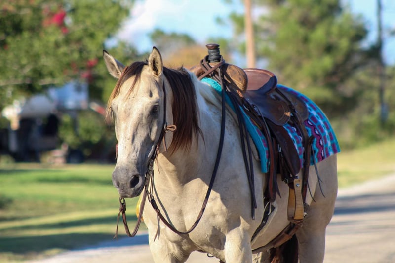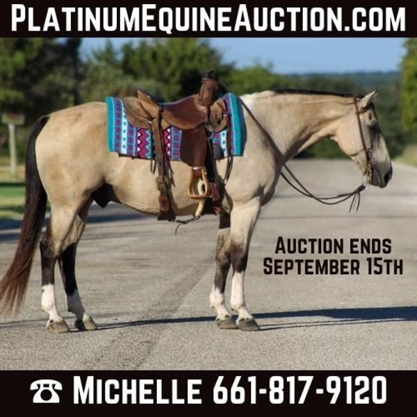 ONLINE AUCTION Place your bids at www.PlatinumEquineAuction.com Starting Bid $3500 Auction ends September 15th, 2024 Need a new saddle? Check out White Rock Saddles on our website or Facebook! Everyone meet “Rio” this guy has a heart of gold! Rio is a 12 year old buckskin paint gelding standing 15 hds tall . Rio will check all your boxes when looking for your next forever partner . He’s stout made , gorgeous color and is always ready to go out and get the job done . Rio has been used around the ranch to gather cows , check fences and load trucks on . He loves to hit the trails and will go all day long for you . He is a very confident guy and always willing to please. Rio goes wherever you point him , he’s been hauled on many over night camping trips to the national parks. He will go up and down hills , cross logs , bridges , and from the smallest creeks to the deepest water he will walk right in every time with zero hesitation. He is not bothered by campers and wildlife he handles it all with ease . Rio rides out in a group or alone , he will go wherever you place him in the group front , middle or the end . He will ride out down the busy hwy for you with heavy traffic including semi trucks flying by. In the arena he will walk , trot and lope circles always picking up the correct leads . He is very user friendly and always stays gentle taking care of his rider . Rio speaks for himself , he’s a super sweet gelding with a heart the size of Texas . Rio is the complete package that doesn’t disappoint. He is easy to catch , stands tied quietly , stands for the farrier , loads and unloads off the trailer like a perfect gentleman. He stands to be mounted, easy to saddle and bridle never giving you any issues. Contact us to come try him, or we can set up a FaceTime also. If you need help with transport don’t hesitate to ask we have a list of reputable haulers that can get him safely to your doorstep world wide. Located in Stephenville, TX. Contact M $ Performance Horses Michelle 661-817-9120 with any questions. ONLINE AUCTION Place your bids at www.PlatinumEquineAuction.com Starting Bid $3500 Auction ends September 15th, 2024 Need a new saddle? Check out White Rock Saddles on our website or Facebook!