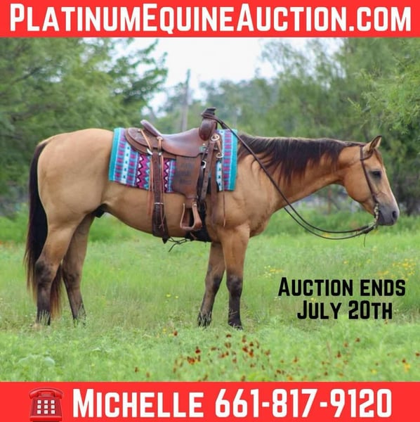 ONLINE AUCTION Place your bids at www.PlatinumEquineAuction.com Starting Bid $3500 Auction ends July 20th 2025 Need a new saddle? Check out White Rock Saddles on our website or Facebook Son Of Doc O Peppers, your next favorite equine partner! This stunning 2012 AQHA registered buckskin gelding stands at a solid 15 hands and is sure to turn heads wherever you go. He’s Americas favorite color and has a charming personality, DR Pepper is not just a pretty face—he’s an incredibly versatile ranch horse who knows the ropes! From roping and doctoring sick cattle to gathering and loading trucks, DR Pepper has done it all. He’s extremely well-trained and cowy making him a reliable partner in any ranching task. Plus, he’s been in the cutting pen, turning back cattle, and has plenty of experience at the sale barn, too. This fancy gelding is one-handed broke and rides beautifully in the bridle. He has smooth transitions, whether you’re in the arena or out on the trails. With a pretty turnaround and a big stop, he’s all about those smooth moves! He can side pass to open and close gates and has confidently navigated ground poles, tarps, and bridges on the trail course. If you’re looking for a horse that excels in ranch riding events, DR Pepper has all the buttons you need to shine in the show pen. He rides out on trails like a champ, effortlessly crossing downed trees and tackling hills—just point him in the right direction, and he’s ready to go! Whether you prefer riding solo or with a group, he’s fine with either. With his impressive pedigree, including being a grandson of the legendary Doc O Lena, DR Pepper comes from a line of proven winners. While he’s ready to impress, I’d recommend him for an intermediate rider who can appreciate just how fancy broke he truly is with all his buttons. If you’re ready to add a talented and reliable partner to your team, look no further than Dr Pepper He’s waiting to help you tackle any job you throw his way. We are open to anyone interested in him to schedule a time to come see him or if you can’t make it schedule a FaceTime showing to see him. If you need help with transport don’t hesitate to ask we have a list of reputable haulers that can get him safely to your doorstep WORLD WIDE including, Alaska , Mexico, Hawaii, Canada and anywhere in between from Stephenville, TX. Contact M$ Performance Horses Michelle 661-817-9120. ONLINE AUCTION Place your bids at www.PlatinumEquineAuction.com Starting Bid $3500 Auction ends July 20th 2025 Need a new saddle? Check out White Rock Saddles on our website or Facebook
