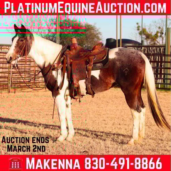 ONLINE AUCTION Place your bids at www.PlatinumEquineAuction.com Starting Bid $3500 Auction ends March 2nd, 2025 Need a new saddle? Check out White Rock Saddles on our website or Facebook! Miss Pie is an 13 year old grade mare. She stands at 15.1hh tall. She has the most precious face with the prettiest, gentle and kind eye. This sweet mare has been used for almost anything you can think of. She is an excellent trail horse! She will gladly climb up or down anything that you point her nose towards. Pie will happily go through any body of water without missing a beat. Pie is not spooky on the trails and can handle any situation that you might encounter, whether that be wildlife, fallen trees, ditches, or treacherous terrain. She is a great leader, but also has no issues falling behind in the back if you want her too. She is calm and sure footed! Pie has been hauled out to town and to rodeos with many distractions and crowds! Pie is a breeze to catch and will come up to you anytime she sees you at the gate. She will load in any trailer without any fuss. Pie is the perfect addition to any barn. He has such a sweet disposition and loves attention and affection. Located in Lipan, TX. We can help arrange hauling anywhere in the US, Hawaii or Canada! Please call or text Makenna Cosby 830-491-8866. ONLINE AUCTION Place your bids at www.PlatinumEquineAuction.com Starting Bid $3500 Auction ends March 2nd, 2025 Need a new saddle? Check out White Rock Saddles on our website or Facebook!