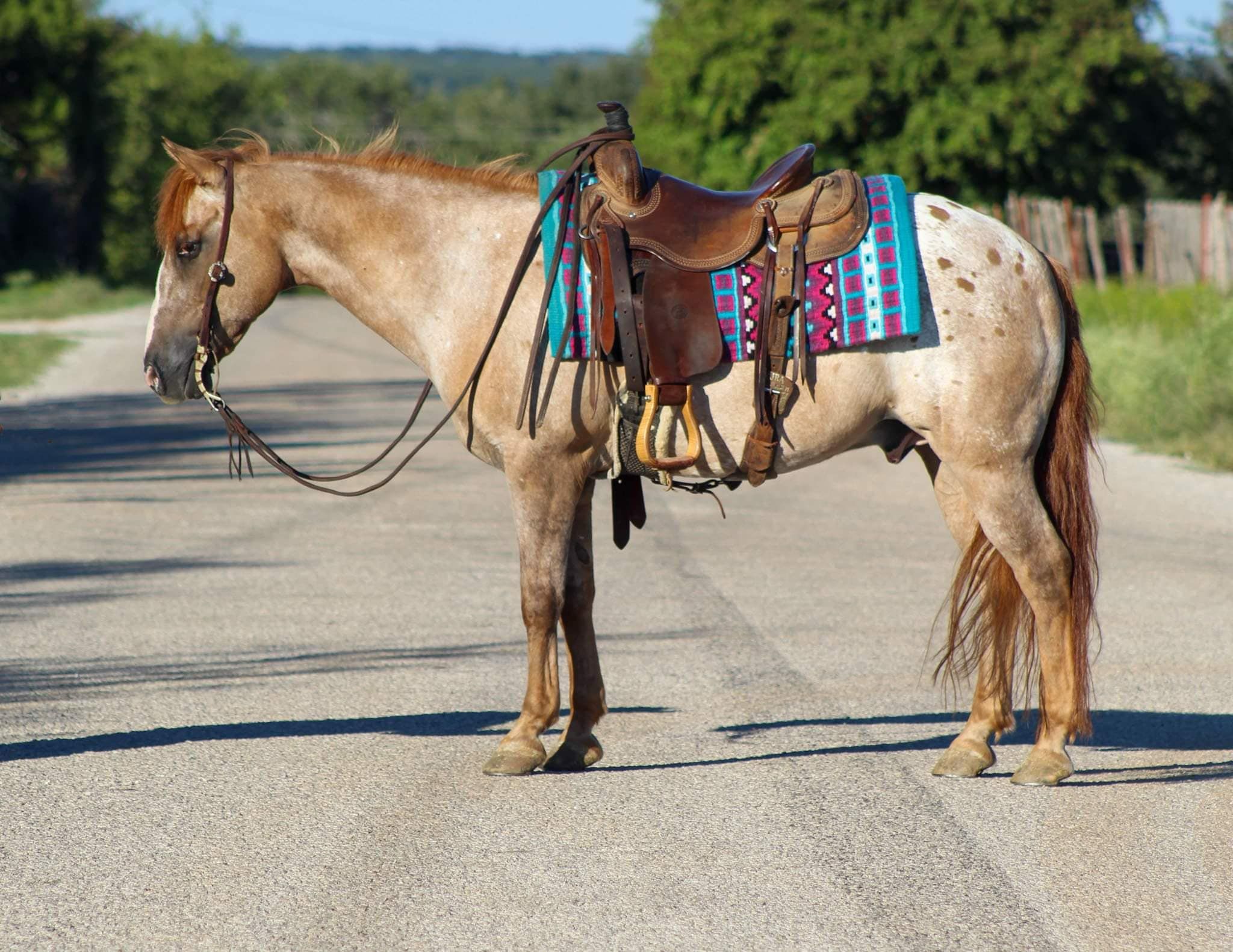 ONLINE AUCTION Place your bids at www.PlatinumEquineAuction.com Starting Bid $3500 Auction ends September 29th, 2024 Need a new saddle? Check out White Rock Saddles on our website or Facebook! Juicebox is an amazing once in a lifetime pony !! And gorgeous to boot! He is the prime age of 13 years old and standing 13.2 hds tall . He is a flashy red dun appaloosa gelding . If you looked up the definition of a true all around pony his name would pop up every time. There isn’t anything he hasn’t seen or done . Juicebox rides english and western , has done ranch work , roped the breakaway dummy on , runs the barrels and poles , has jumped small cross rail jumps , and goes down the trail like a seasoned veteran every time . He is one that the WHOLE family can enjoy and be absolutely safe on . He’s big enough for even the adults to ride and have fun on. Juicebox has had a TON of training which makes him the fancy riding pony he is . Absolutely nothing bothers this guy at all . Take him out to check the cattle and fences on . He has been rode on all kinds of trails including right down the busy bricks of Exchange Ave at the world renowned Fort Worth Stockyards with traffic , crowds of people , horse carriages, longhorns , loud music and plenty of other distractions. He’s always a town favorite getting all the attention because he’s absolutely perfect ! Juicebox has seen many nights of over night camping trips in the mountains, he’s been down miles and miles of trails at the National Parks from rough steep terrain to the flat grasslands he handles it all with ease all while keeping his rider safe . He will ride right into the river every time with zero hesitation, he will cross bridges and logs. In the arena he’s just as perfect he neck reins the very best , he breaks at the poll, he will walk, trot and lope beautiful circles all day long . He’s absolutely a kids dream pony to take to the 4H shows or even do the drill team on or go to the jr rodeos, he packs a flag with no issues at all. Ones like Juicebox are hard to come by and you will drive the wheels off your truck searching for one like him, he’s that once in a lifetime unicorn that you don’t want to miss . He is perfect for any level rider including the brand new beginner horse lover. His size is absolutely perfect for the smaller kids and does not intimidate them. He stands like a perfect gentleman for bathes , easy to tack up and bridle. He stands to be clipped and groomed, loads in and out of the trailer. Juicebox is the sweetest boy that’s always in your pocket loving all the attention and cookies. Contact us to come try him, or we can set up a FaceTime also. If you need help with transport don’t hesitate to ask we have a list of reputable haulers that can get him safely to your doorstep world wide. Located in Stephenville, TX. Contact M $ Performance Horses Michelle 661-817-9120. ONLINE AUCTION Place your bids at www.PlatinumEquineAuction.com Starting Bid $3500 Auction ends September 29th, 2024 Need a new saddle? Check out White Rock Saddles on our website or Facebook!