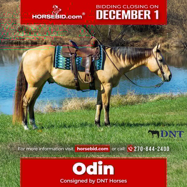 ⚜️ 𝓽𝓱𝓮 𝐇𝐨𝐫𝐬𝐞𝐦𝐚𝐧'𝐬 𝓢𝓱𝓸𝔀𝓬𝓪𝓼𝓮⚜️ Happening now thru MONDAY | DECEMBER 1st - Available EXCLUSIVELY on HorseBid's website! For more details and to register visit: www.Horsebid.com CONSIGNOR CONTACT: DNT Horses 270-844-2400 LOCATION: Henderson, KY BREED: Quarter Horse REGISTERED: Yes REGISTERED NAME: Rainbow Orphan San COLOR: Dun HEIGHT: 14.3 AGE: 14 GENDER: Gelding “Rainbow Orphan San” aka Odin checks every box you could possibly think of in finding that perfect horse. He is what everyone dreams of owning in a trail horse. “RAINBOW ORPHAN SAN” aka Odin is a 2011 model gorgeous Dun Gelding. He stands 14.3hh tall with a solid and correct build. If you are looking for a Safe, Trustworthy, Reliable, Sane, Been there done that, and Sound partner! Look absolutely no further! Checking all the boxes to find your dream horse, check out Odin the search is over! Odin is the kind everyone wants! He is honest, easy-going, and one anyone can enjoy! Anyone from the whole family, Kids, Grandma, Friend of a friend who has never rode, or your unknowledgeable wife or husband! Odin is the kind you can let sit for days, weeks, or months and he will always be the same, just like he’s been ridden every day! Odin is kind and patient. He is one that can put up with just about anything, Screaming Kids, Barking Dogs, Farm equipment, Fireworks, Sirens, and Traffic! He is the most genuine horse I have ever been around! He handles everything with confidence and will surely take care of any rider that is lacking such. He is like a seasoned babysitter! Odin rides excellent in or out of the arena. He will walk, trot, and canter. He picks up both of his leads. He will neck rein, backup, side pass and works off leg pressure. Odin is an easy ride no need for any training! He is soft in the bridle, takes a light or heavy hand with no fuss. He never gets hot or silly. He has the rarest old soul for a horse with lots of life! Odin has been around cows and he could be the perfect pick to take to a sorting or go gather cattle on the ranch. Odin has been trail rode extensively and is one that everyone chooses to take from the barn! He goes wherever you point him. He crosses over logs, bridges, obstacles and loves to go through water! He will ride alone or with a group! You can ride him bareback or with a saddle whichever you chose. Whether you are 5 or 85 he will take care of you every step of the way! Odin is just perfect in every aspect you can think of! Odin has been through the police academy and has worked on the police force as well. So, he is used to all kinds of noises and surprises. He does not get excited over anything. Odin will stand at a mounting block, large log, picnic table, trailer side or truck side for you to get on him. He stands to get saddled, unsaddled, mounted, and dismounted from! He loves attention, such as being brushed and bathed. Odin is easy to catch he will greet you at the gate. He stands quietly for the farrier. He loads and unloads on and off the trailer. He is a true saint! Odin is the type of horse that doesn’t come around often, he is the kind everyone dreams about owning! Well, here he is! Check out his Video! Feel free to reach out to Tasha 270-844-2400 A PPE is welcome at the buyer’s expense. Odin will come with a current coggins, UTD on vaccines and health certificate! Don’t hesitate to call and make an appointment to come, try him! Odin is one you don’t want to miss!