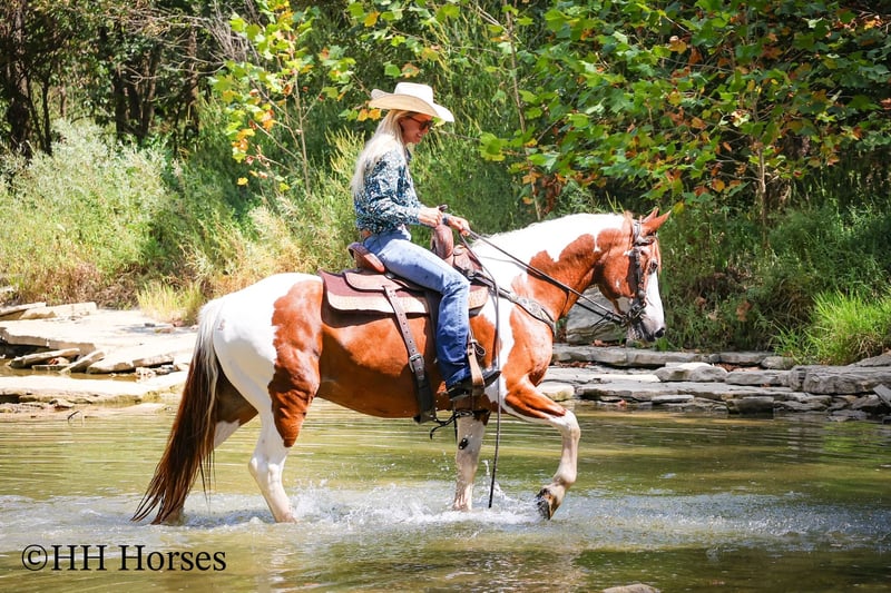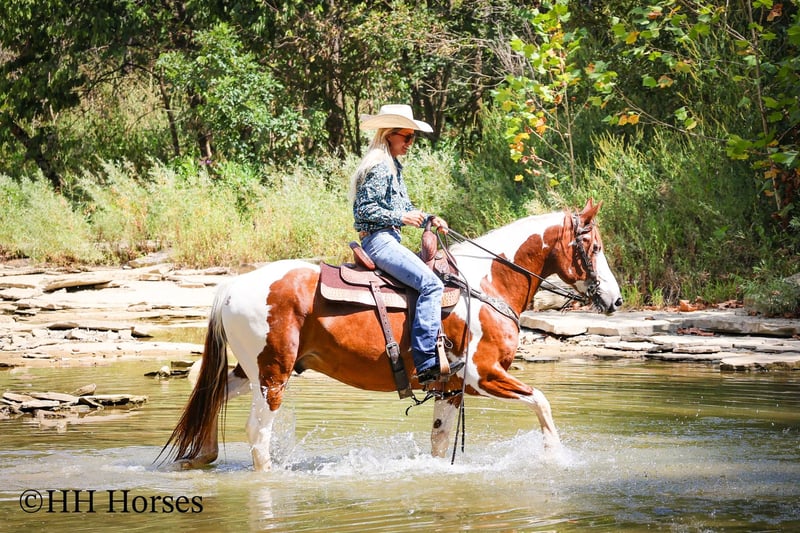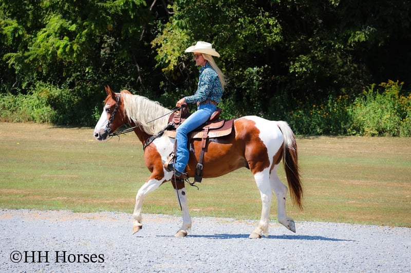 ONLINE AUCTION Place your bids at www.PlatinumEquineAuction.com Starting Bid $3500 Auction ends September 14th, 2025 Need a new saddle? Check out White Rock Saddles on our website or Facebook This is “TECUMSEH”, a loud colored, flashy, sorrel and white TOBIANO PAINT GYPSY CROSSBRED GELDING that has been used for trail riding, arena work, and ranch work. He is 3/4 Paint and 1/4 Gyspy. This gelding is a superb trail mount, he is traffic safe, and not spooky. He is stout made and stands 14.3 hands tall. He is 14 years old. He is very fun to ride, he has a smooth easy to sit jog and a collected canter. He stops easily on whoa, backs up, and walks out nicely on the trails. He will cross the water, go through the woods, and take his time up and down steep embankments. He has been used in the pastures to check cattle and fences. He rides out alone and goes willingly anywhere you point him. He is attractive, well built, has a head full of sense, and he is gentle to work around. He stands tied, loads, bathes, and hauls with no fuss. He is a cool horse with lots of style. Located in Flemingsburg, KY. Contact Erin with HH Horses 304-238-4155 with any questions or to make a Buy It Now Offer. ONLINE AUCTION Place your bids at www.PlatinumEquineAuction.com Starting Bid $3500 Auction ends September 14th, 2025 Need a new saddle? Check out White Rock Saddles on our website or Facebook