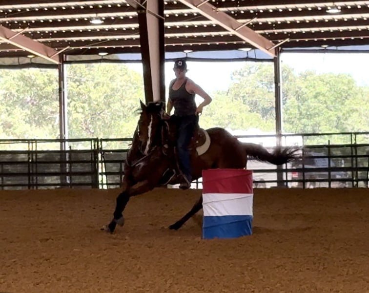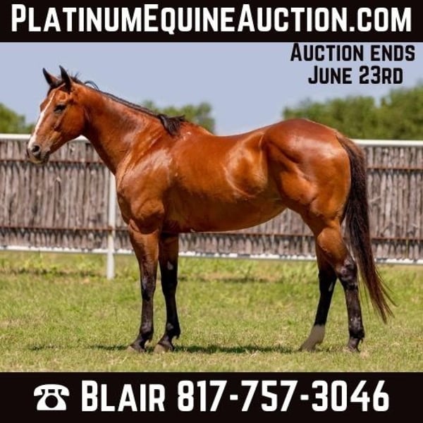 ONLINE AUCTION Place your bids at www.PlatinumEquineAuction.com Starting Bid $3500 Auction ends June 23rd, 2024 Need a new saddle? Check out White Rock Saddles on our website or Facebook! Miss Leo There Saggy aka “Swift” is a 2011’, 15.1H AQHA bay mare. The best of both worlds, from the trail to the barrel race, this mare is quiet and EASY! Swift has been used primarily as a trail horse with an elderly lady who also ran the barrels on her! She is a very quiet mare that rides really nice and handy! When we say barrel horse, don’t picture high headed and hot. This mare is chill and relaxed and NEVER gets hot or anxious, at a race or on the trails! She is absolutely calm down the ally every single run you make on her and would be the PERFECT fit for a beginner or novice rider who wants to run barrel and pleasure ride! Swift rides one handed and stops perfect! She’s extremely easy to operate and simple to ride inside and out of the arena. Anyone that has never ran the barrels will get along with the mare! She has a good personality and when really warms up to her new person, she’s the ride or die type you’ll never want to part with! She loads, leads, bathes and ties great! She just got her teeth done by an equine dentist and has a fresh set of shoes! Swift is ready to go hit the trails or the next jackpot with her next person! Go to her website page northtexashorsecompany.com/swift for more pictures and footage! Please call Blair with North Texas Horse Company for more info at 817-757-3046. We love to talk about her! We are located in Weatherford, TX and can help arrange affordable shipping to anyone!! ONLINE AUCTION Place your bids at www.PlatinumEquineAuction.com Starting Bid $3500 Auction ends June 23rd, 2024 Need a new saddle? Check out White Rock Saddles on our website or Facebook!
