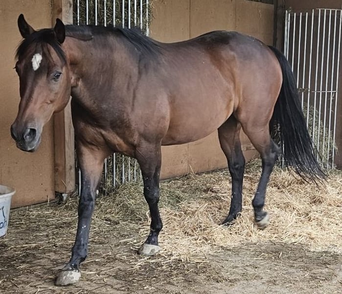 My horse Jamie is looking for a loving home. Beautiful 14-year-old bay Quarter Horse gelding, standing at 15.6 hh. Jamie has been registered with AQHA since 2014 and with DQHA since 2015, and has regularly competed at shows with his previous owners. He is friendly and people-oriented, enjoys moving in all gaits, and can even jump over fallen trees or poles at the riding arena. He also appreciates just going for walks. Until mid-2022, he was used as a school horse, ridden with professional partial training and physiotherapy, kept in a paddock with outdoor shelter. Since then, he has been living with Romeo at our home in an open stable with permanent turnout on 4,000 to 40,000 square meters, depending on weather conditions. He is calm when farrier work is done, relaxed during grooming and tacking. Grooming can also be done without being tied, as long as it’s within a fenced area. Not spooky, at home, on rides alone or in company, and during trailer loading. Open to new people and animals; here, he lives with dogs, cats, chickens, and cows (on the neighboring property). Since 2023, he has not been shod, as he mainly stays on pasture, but he also walks on roads or field paths without any issues. He is regularly dewormed and presented to the farrier. There are no signs of chronic illness or injuries. In summary, he has a remarkably calm character and is perfect for someone looking for a versatile, reliable, and friendly horse. Who is this horse suitable for? This wonderful partner is ideal for both beginners and experienced riders seeking a horse for sport disciplines and creative work. He is also excellent for families looking for a loyal and dependable mount. For more information or a personal conversation, I am happy to assist.