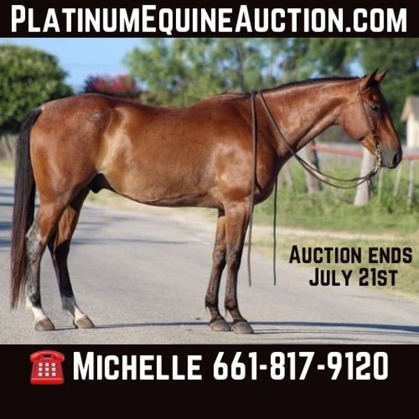 ONLINE AUCTION Place your bids at www.PlatinumEquineAuction.com Starting Bid $3500 Auction ends July 21st, 2024 Need a new saddle? Check out White Rock Saddles on our website or Facebook! “Akon” is a 13 year old Bay Roan Gelding standing 15.2 hds . We cannot explain enough just how simply amazing this gelding is! Akon is truly one in a million and we believe his new family will agree. Ropings to rodeos, ranch work to trails, this boy does it all! He is big, stout and a head turner all in one. Akon is a perfect gentleman . He is very easy to handle, stands for everything from shoeing to saddling. He loads like a dream and hauls good with other horses and cattle. He stays turned out with 4 other geldings , gets along good with mares as well and does fine in a stall. He has been hauled all over the United States from rodeos to World Series ropings . He is a finished head horse, for any level roper to go on with. He is very quiet in the box, leaves flat and smooth and makes a pretty move in the field. Akon is the same every single run whether it’s one steer at a rodeo or 15 steers at a roping! He is also a finished breakaway horse and has been heeled on . We have used him in the grand entry’s at rodeos and also to push stock out of the arena . Take him to the ranch , we have used him to sort , gather , and rope sick cattle on , and also load trucks on him . Out on the trail he is a blast to ride! Akon goes through and over anything you point him towards. He loves water and is always eager to go. Akon is pretty enough, and classy enough to go to the show pen as well and would be great at that as well. He has a beautiful walk/trot/ lope and very easy smooth transitions. He lopes out of your hand like butter and moves off your legs perfectly. Akon is strong and athletic with the looks to boot. We couldn’t ask for a more perfect horse and it has been a very hard decision to part with him. If you need help with transport don’t hesitate to ask we have a list of reputable haulers that can get him safely to your doorstep world wide. Located in Stephenville, TX. Contact M$ Performance Horses Michelle 661-817-9120. ONLINE AUCTION Place your bids at www.PlatinumEquineAuction.com Starting Bid $3500 Auction ends July 21st, 2024 Need a new saddle? Check out White Rock Saddles on our website or Facebook!