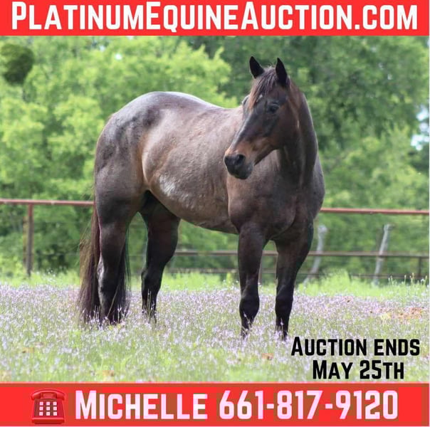 ONLINE AUCTION Place your bids at www.PlatinumEquineAuction.com Starting Bid $3500 Auction ends May 25th, 2025 Need a new saddle? Check out White Rock Saddles on our website or Facebook! Meet Blue Moon, the incredible 14-year-old roan gelding who’s ready to steal your heart! Standing at a perfect 15.2 hands tall, he’s the seasoned veteran you’ve been searching for. This true blue ranch horse has spent his life helping cowboys get the job done making a living and he’s seen it all—dragging calves, gathering cattle, sorting, and loading trucks. If it’s ranch work, Blue Moon has done it! This lovely gelding is one-handed broke and rides like a dream. Whether you’re a seasoned rider or just starting out, Blue Moon is safe and user-friendly, making him a perfect choice for anyone looking to enjoy the great outdoors. Just point him in the direction you want to go, and off he goes. He’s got great smooth gaits and can walk, trot, and lope perfect circles all day long, always picking up the correct leads. He moves off your legs with ease, he will side pass right over to gates to open and close them. Blue Moon is fantastic on the trails, tackling hills, crossing water, logs, bridges, and brush without a hitch. He’s even navigated the bustling streets of the famous exchange Ave at the historic Fort Worth Stockyards, so you know he’s as reliable as they come! Not only is he a joy to ride, but he’s also a sweetheart who greets you at the pasture gate and gets along wonderfully in a herd. Whether you choose to stall him or let him roam, he’s adaptable and easygoing. If you’re looking for a one-in-a-million unicorn, Blue Moon is your guy! He’s truly a pleasure to own and ride, and he’s ready to be your trusty companion on all your adventures. Come meet him—you won’t be disappointed! If you can’t make it schedule a FaceTime showing with us and you can meet him that way also. He is absolutely UTD on everything . Teeth just floated , just wormed , and a fresh set of shoes. He is easy to catch, groom, saddle and bridle. He loads and unloads off the trailer. If you need help with transport don’t hesitate to ask we have a list of reputable haulers that can get him safely to your doorstep WORLD WIDE including, Alaska , Mexico, Hawaii and Canada. For more info contact M $ Performance Horses Michelle 661-817-9120. ONLINE AUCTION Place your bids at www.PlatinumEquineAuction.com Starting Bid $3500 Auction ends May 25th, 2025 Need a new saddle? Check out White Rock Saddles on our website or Facebook!