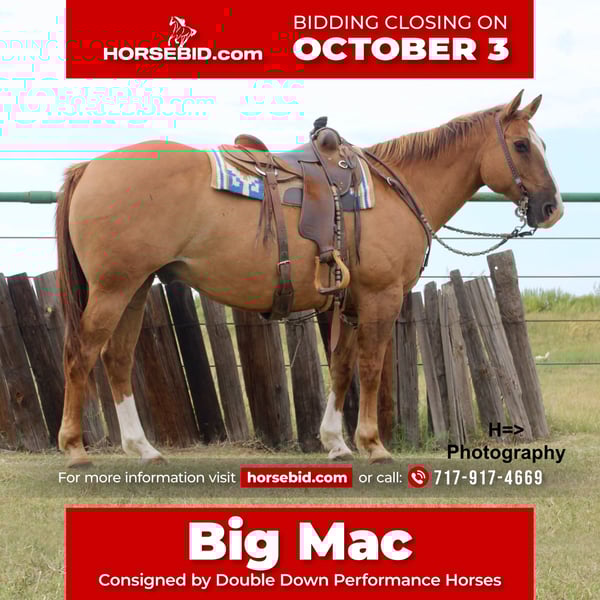 - Happening now thru | - Available EXCLUSIVELY on HorseBid's website! For more details and to register, visit www.horsebid.com CONSIGNOR CONTACT: Double Down Performance Horses 717-917-4669 LOCATION: Cushing, OK BREED: 1/4 Belgian 3/4 quarter horse REGISTERED: No COLOR: Red Dun HEIGHT: 15.3 AGE: 11 GENDER: Gelding "Big Mac is a gorgeous 1/4 draft 3/4 quarter horse red dun gelding that stands 15.3 hands. He is super gentle, has a friendly people loving personality, easy to catch, loves bathes, and stands great to braid. Big Mac trail rides exceptional, he's done all the chores around the ranch, and is not spooky or flighty. He is good with a rope, tarps, drags the log, and will cross wooden bridges and marsh ground. Big Mac rides nice in the arena, knows his leads, carries himself soft and collected, moves off leg pressure, and has a good neck reign. He is great with dogs and gunfire. He has a very smooth, comfortable trot and a nice lope. Big Mac stands to mount and is good with a mounting block. He is a point and go kinda guy with absolutely no fuss or nonsense. Big Mac does not require regular riding and will saddle up gentle after long periods of time off. For additional information, contact Darla 717-917-4669 " LOCATION Cushing, OK