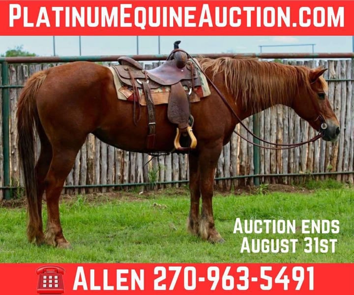 ONLINE AUCTION Place your bids at www.PlatinumEquineAuction.com Starting Bid $3500 Auction ends August 31st, 2025 Need a new saddle? Check out White Rock Saddles on our website or Facebook If you’re looking for a true confidence-builder, Ann is the mare you can trust with anyone. At 14 years old and standing 15.2hh, she is solid, seasoned, and as dependable as they come. Ann is husband safe, kid safe, and beginner safe. She is kind, patient, and forgiving, making her the perfect match for someone learning to ride, a family wanting a trustworthy horse, or anyone who simply wants a gentle, reliable partner. She rides quiet and steady every time you saddle her. Ann has smooth, easy gaits, neck reins, and will walk, trot, and lope willingly without ever getting hot or pushy. She’s the type you can leave off for weeks and then step right back on without missing a beat. On the trail, Ann is confident and sure-footed. She crosses water, handles rough terrain, and is both traffic- and arena-broke. She stays calm whether you’re out alone or in a group, and she takes new places and situations in stride without fuss. On the ground, Ann is just as easy. She’s simple to catch, stands tied, loads and hauls well, and is good for the farrier and vet. She’s quiet in the pasture and gets along well with other horses, but she’s equally content in a stall. If you’ve been searching for a dependable, family-friendly horse with the right size, age, and disposition, Ann is the one. They don’t come any safer or more reliable. We are able to arrange shipping anywhere from Hawaii to Canada and any state in the U.S. He is located in Lipan, TX. Please Call or text Am Livestock Allen 270-963-5491 for serious inquiries. ONLINE AUCTION Place your bids at www.PlatinumEquineAuction.com Starting Bid $3500 Auction ends August 31st, 2025 Need a new saddle? Check out White Rock Saddles on our website or Facebook