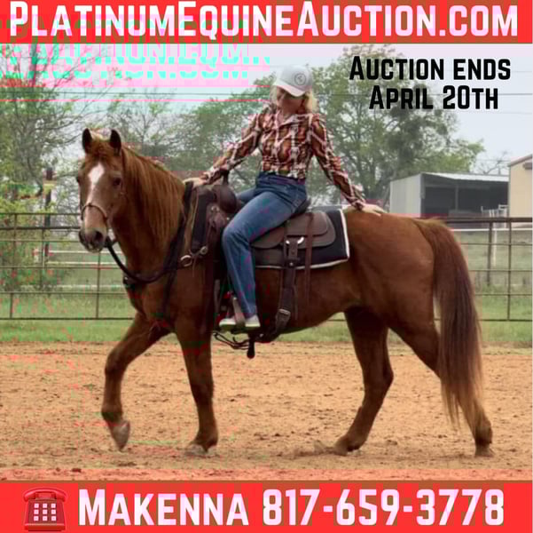 ONLINE AUCTION Place your bids at www.PlatinumEquineAuction.com Starting Bid $3500 Auction ends April 20th, 2025 Need a new saddle? Check out White Rock Saddles on our website or Facebook! Andy is a been THERE, done THAT 14.1H, 15 yr old sorrel gelding. He has spent his life as a dude ranch horse in Oklahoma and was primarily used by kids! Andy has an absolute heart of gold and is sure to keep your family safe! He is extremely gentle, kind and easy going. He’s the type of horse that you can leave off for months and pull up fresh to saddle up and go! He loves attention and is a total puppy dog. Andy would thrive as a family horse, trail horse or even lesson horse for anyone from kids to beginner adults! He’s a kind soul who aims to please!! He rides good and knows all the things. The kids rode him in just a halter all the time and he stays broke in just a bosal/hackamore set up! He moves off leg, goes the speed you ask, has super COMFY gaits and stops right when you ask! Andy has absolutely ZERO buck, bolt or rear and is incredibly gentle. He’s easy stands quiet for mounting and dismounting and isn’t one you have to micro manage to have a good time! He’s great with all new sights and scenes. He’s not bothered by anything, loads, leads, bathes and ties great! He’s easy to catch and comes right to you for attention! He would be the perfect starter horse or baby beginners horse! Andy is such a sweet boy and is ready to go be someone’s confidence booster! More pics and videos on his website page at northtexashorsecompany.com/andy. Please call Blair with North Texas Horse Company for more info at 817-757-3046. We are located in Weatherford, TX and can help arrange affordable shipping to anyone!! ONLINE AUCTION Place your bids at www.PlatinumEquineAuction.com Starting Bid $3500 Auction ends April 20th, 2025 Need a new saddle? Check out White Rock Saddles on our website or Facebook!