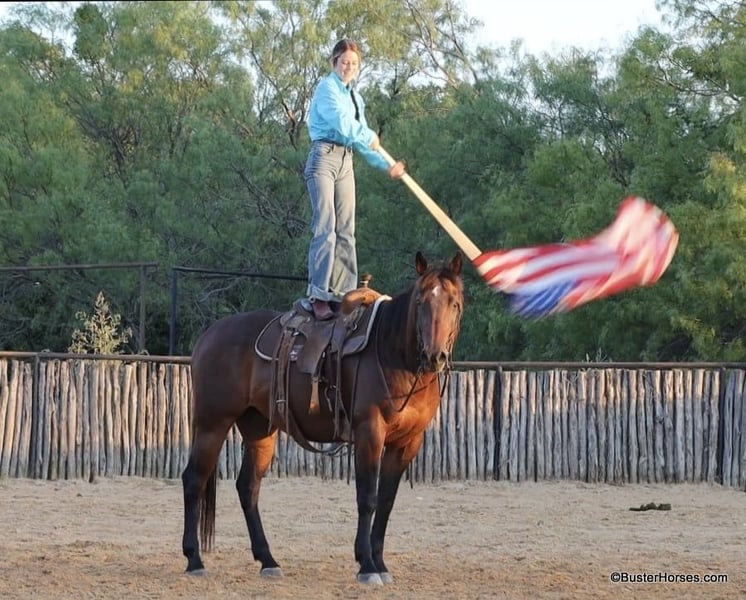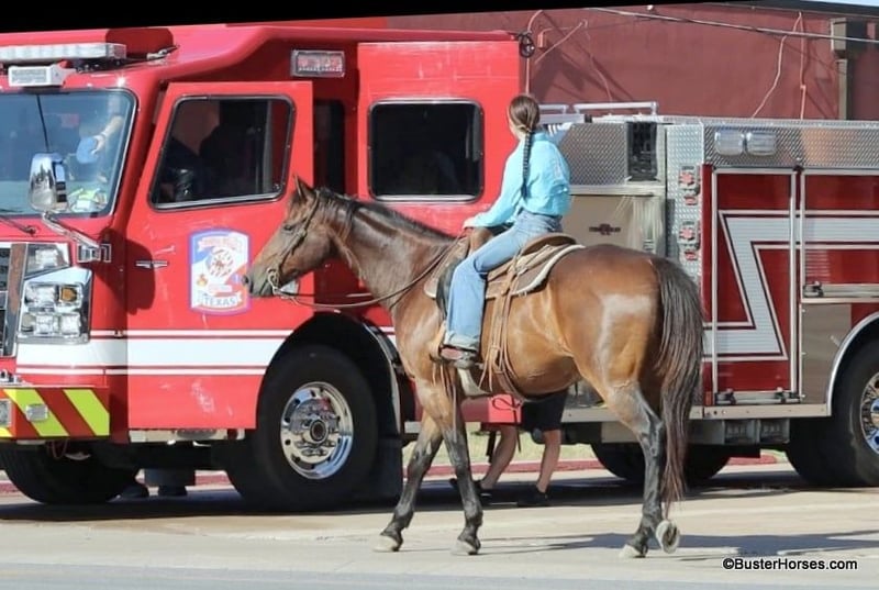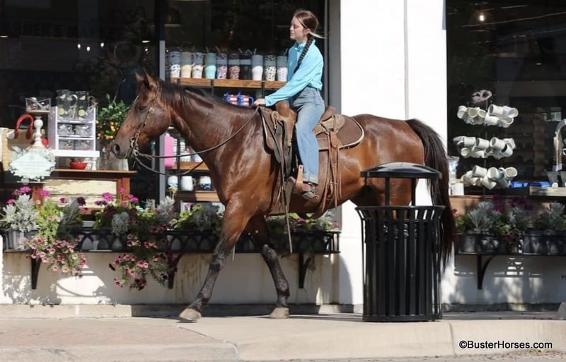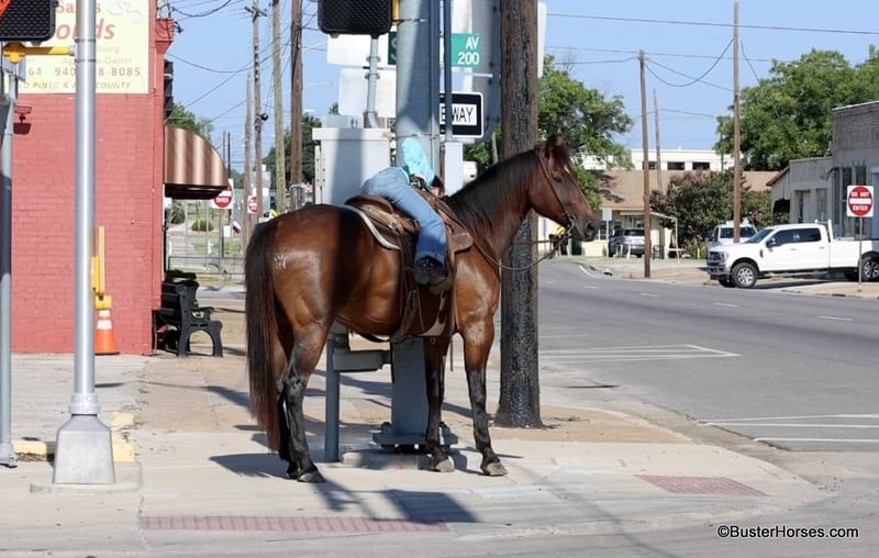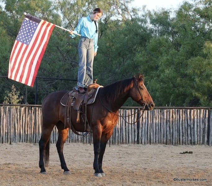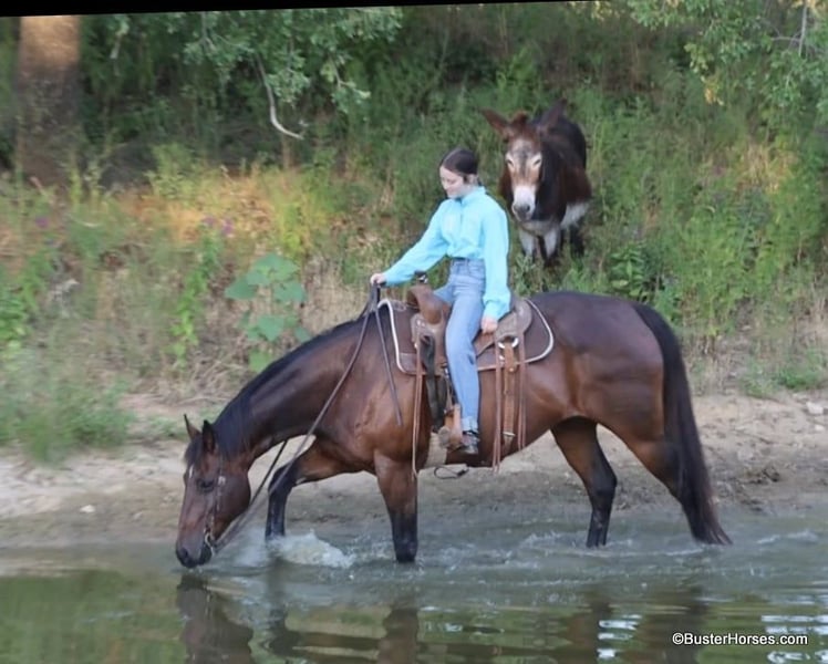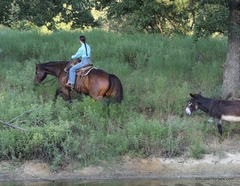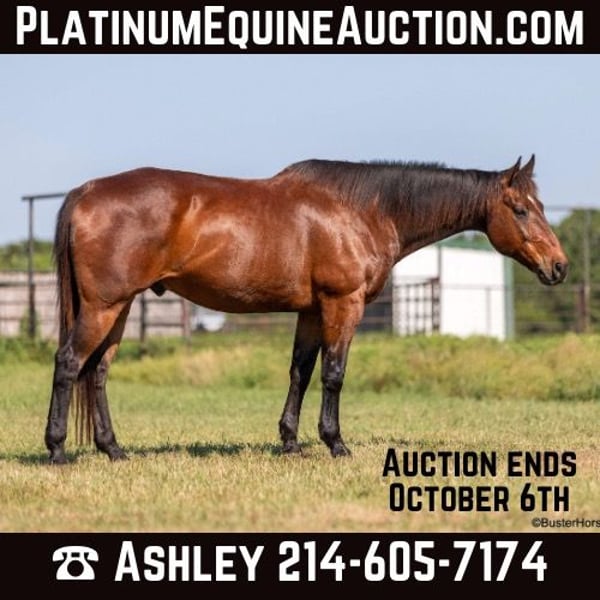 ONLINE AUCTION Place your bids at www.PlatinumEquineAuction.com Starting Bid $3500 Auction ends October 6th, 2024 Need a new saddle? Check out White Rock Saddles on our website or Facebook! “Pudge” – 16H, 14 year old bay grade quarter horse gelding “Pudge” is our resident lesson horse and is an exceptional confidence booster! His odd big claim to fame around here,…is that he has never had even ONE rider part ways with him – and all of our beginners learn to trot and lope in a bareback pad before they get to use a saddle – so parting ways with their horse, just happens! However, Pudge is absolutely INSANELY smooth, steady, cadanced, and solid – it is pretty near impossible to fall off of this guy, you have to just bail off of the side of him on purpose to come off of this one! He is a saint and very loved around here and everyone will be sad to see him go, but most of our riders have graduated up to faster horses, and Pudge deserves his forever family where he can be a beloved family member and pet. Pudge is amazing in traffic and out on the trial – he is very happy and confident alone, or will go absolutely anywhere that you place him in a group. He loads and hauls like a pro and stands tied quietly on the trailer when you get there. Near perfect ground manners, very easy and soft and respectful on the ground, but still sweet, loving, and friendly towards his handlers. He loves living in the barn but we mostly keep him turned out in a group of geldings outside, he is fat, an easy keeper, and on no-maintenance! Always eager to be caught, and the first one to you when you go to catch the horses. He knows his job and is the same horse if we pull him up once a week or once a month. He is very smooth and as uncomplicated as they come to ride! We have tons of additional videos of this guy! To see additional videos, go to our website: BusterHorses.com or our Facebook page Buster Horses Pudge was just shod this past week, his teeth were also done by an equine dentist this spring, and he had his sheath cleaned, his ears preemptively treated for ticks, and he was also power packed wormed. He is good to shoe, has great feet and also goes well barefoot – if his new owner prefers him to be barefoot, we can have his shoes pulled and trim him prior to him heading to his new home. He will arrive at his new home up-to-date and ready to go to work! Please call anytime for more information at 214-605-7174 Pudge is located in Weatherford, TX – one hour from Dallas / Fort Worth International Airport. He is an easy day trip or fun overnight trip to come try out, from anywhere! We are experienced, knowledgeable sellers, and we can help with quickly arranging affordable shipping to any buyer’s location – we have experience shipping worldwide – including regularly to Hawaii, Canada, Mexico, Europe, and South Africa. Check our website for buyer reviews, more videos, additional info: etc: https://busterhorses.com/Pudge ONLINE AUCTION Place your bids at www.PlatinumEquineAuction.com Starting Bid $3500 Auction ends October 6th, 2024 Need a new saddle? Check out White Rock Saddles on our website or Facebook!