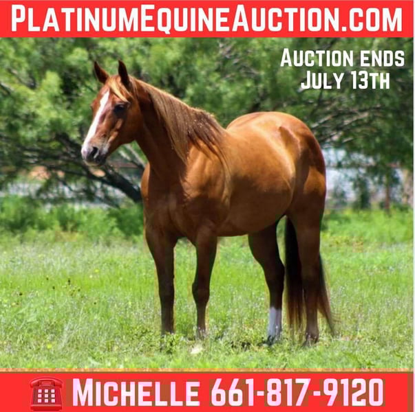 ONLINE AUCTION Place your bids at www.PlatinumEquineAuction.com Starting Bid $3500 Auction ends July 13th 2025 Need a new saddle? Check out White Rock Saddles on our website or Facebook! Meet Einsteins Juice, affectionately known as Clyde! This 2009 AQHA gelding stands at a sturdy 14.2 hands tall, and don’t let his age fool you—he’s got plenty of adventures left in him! Clyde is truly the complete package, boasting a pedigree filled with champions. He’s an own son of Einsteins Revolution, a renowned NRHA million-dollar sire. Clyde is a seasoned veteran with a heart of gold. He’s a finished heel and breakaway horse who has traveled all over the country for rodeos and jackpots, and he’s seen it all! I don’t often use the term “bombproof,” but Clyde truly deserves that title. Whether you’re ranching or just enjoying a day out, he’s got you covered. He’s great for all ranch chores and rides out anywhere with a nice, easy stride. Clyde loves hitting the trails and has no hesitation when it comes to swimming—he’ll walk right into any water! He’s confident on various terrains, and will cross logs, bridges, or tarps. You can even ride him bridle-less down the trails or through the pasture, which speaks volumes about his trustworthiness and training! Clyde has proudly carried flags at multiple rodeo grand entries, showcasing his calm demeanor and versatility. He’s the perfect addition to any family—gentle enough for everyone, from kids to adults. While he might not have a flashy color, being a plain sorrel, Clyde is the horse that 95% of horse seekers are looking for. He’s an absolute gentleman and the sweetest guy around. If you’re looking for a reliable and fun partner, Clyde is ready to steal your heart! Come meet him and see for yourself what a wonderful companion he can be! He does have a cosmetic wire scar on his right front leg. It does not bother him at all it’s just there. We are open to anyone interested in him to schedule a time to come see him or if you can’t make it schedule a FaceTime showing to see him. If you need help with transport don’t hesitate to ask we have a list of reputable haulers that can get him safely to your doorstep WORLD WIDE including, Alaska , Mexico, Hawaii, Canada and anywhere in between. Contact M$ Performance Horses Michelle 661-817-9120 with nay questions. ONLINE AUCTION Place your bids at www.PlatinumEquineAuction.com Starting Bid $3500 Auction ends July 13th 2025 Need a new saddle? Check out White Rock Saddles on our website or Facebook!