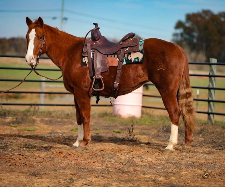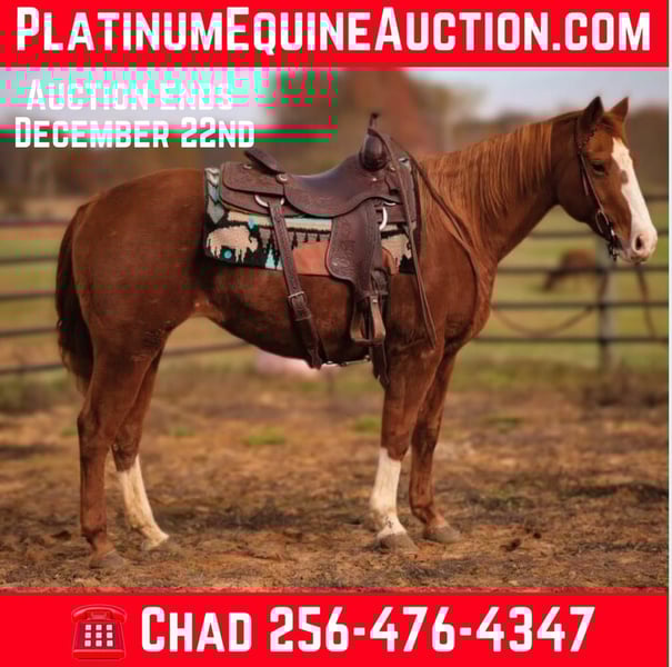 ONLINE AUCTION Place your bids at www.PlatinumEquineAuction.com Starting Bid $3500 Auction ends December 22nd, 2024 Need a new saddle? Check out White Rock Saddles on our website or Facebook! Freckles With Boone aka Sally is 15 years old 14.2 hands tall, top bred mare! She has Peptoboonsmal, Colonel Freckles and Dual Pep on her pedigree. This mare is fancy one hand broke with a big stop. We have used her outside a lot to pen and check cattle. She has had some cutting training and watches a cow very well. If you have one that you need caught, you can also go rope it off of her. She is gentle and safe for the entire family to ride and has no issues! If you are looking for a horse that will do any job, check her out! Contact Chad Little 256-476-4347 with any questions. Located in Mt. Hope, AL. ONLINE AUCTION Place your bids at www.PlatinumEquineAuction.com Starting Bid $3500 Auction ends December 22nd, 2024 Need a new saddle? Check out White Rock Saddles on our website or Facebook!