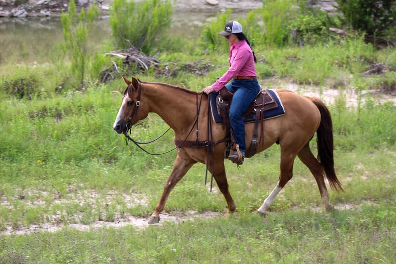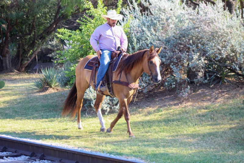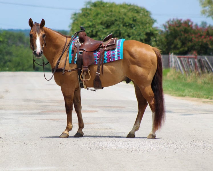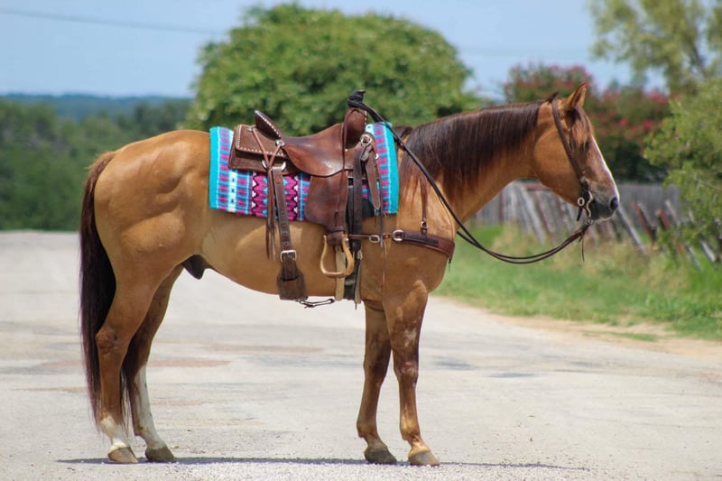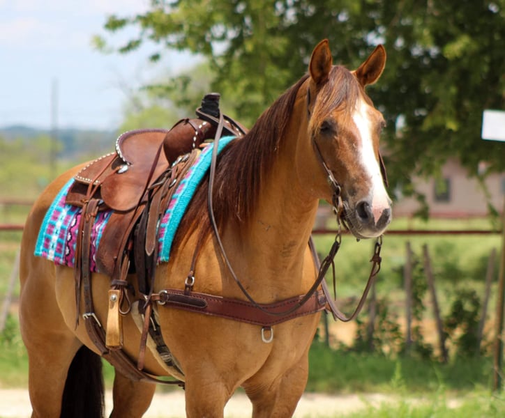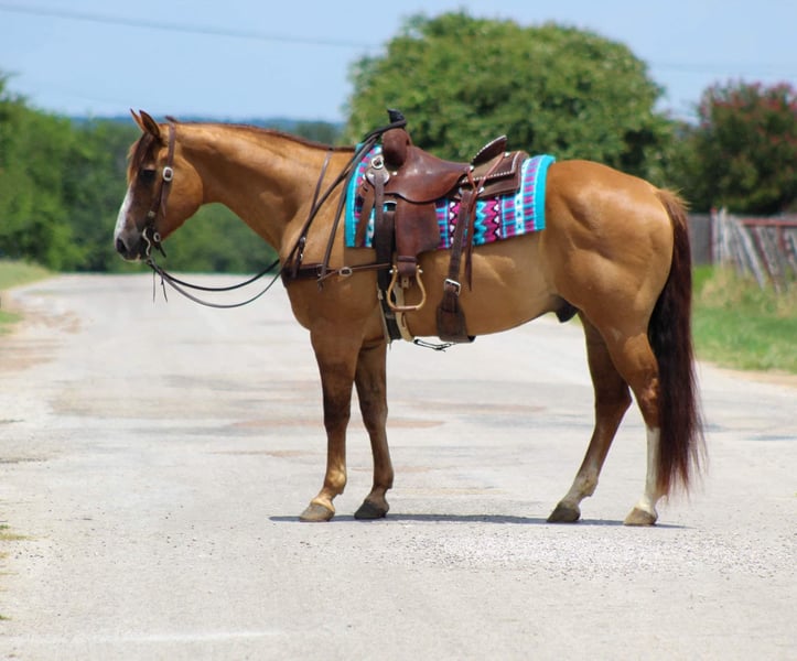 ONLINE AUCTION Place your bids at www.PlatinumEquineAuction.com Starting Bid $3500 Auction ends August 4th, 2024 Need a new saddle? Check out White Rock Saddles on our website or Facebook! If you’re looking for one that is seasoned , tried and true then this guy is the one for you! “Dunny” is a 14 year old gorgeous , stout made red dun gelding standing 15.1 hds tall and has the looks to boot ! This sweet loving gelding has seen the sights and been hauled around the world . He has dabbled in about a little bit of everything he was shown on a college equestrian team for many years and rode by many different riders on the teams . He has a beautiful slow walk , trot and lope and also low headed with a great stop ! He is very user friendly and forgiving. Dunny is awesome out on the trails and will go anywhere you point him! He has been down the famous bricks of Exchange Ave at the Fort Worth Stockyards with crowds of people , traffic and all kinds of commotion and he did it bridle less! He enjoys going down the trails will cross water , rocks , bridges , tarps with no issues at all . Put him in the front , back or middle and he is fine or if you just want to go out on nice rides by yourself Dunny doesn’t mind that either . We recently rode him in our Fourth of July parade and he was a rockstar as always ! Dunny is one the whole family can enjoy! He isn’t one that needs rode consistently leave him turned out for months catch him up and go for a ride . He is currently turned out in a pasture with three other geldings he gets along with everyone . Easy to catch , groom , tack up . He loads and unloads with no issues at all . His teeth were just floated , and just got a new set of shoes put on . He’s ready to go to his new forever home . Watch his video and you will fall In love. Contact us to come try him , or we can set up a FaceTime call. If you need help with transport don’t hesitate to ask we have a list of reputable haulers that can get him safely to your doorstep world wide .Contact M $ Performance Horses Michelle 661-817-9120 Located in Stephenville, TX. ONLINE AUCTION Place your bids at www.PlatinumEquineAuction.com Starting Bid $3500 Auction ends August 4th, 2024 Need a new saddle? Check out White Rock Saddles on our website or Facebook!