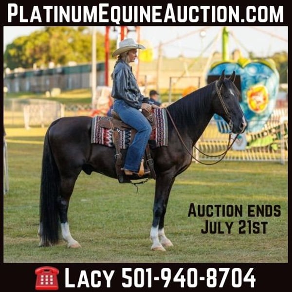 ONLINE AUCTION Place your bids at www.PlatinumEquineAuction.com Starting Bid $3500 Auction ends July 21st, 2024 Need a new saddle? Check out White Rock Saddles on our website or Facebook! This gelding is a classy ride! Batman is the star of the show and turns heads everywhere he goes! Batman is a 15.3H, 15 year old gelding who is equally as broke as he is handsome, making him the perfect package! He has been ridden extensively on the trails and will be surefooted and confident in all types of terrain. He handles everything like the seasoned professional that he is. Batman has seen the bright lights of town, traffic, etc. and takes it all in stride. He rides on a loose rein, has a pillow soft way of gaiting, is responsive to riders ques and is an absolute joy to ride. He has been ridden by all levels of riders without issue. Batman is also a perfect gentleman to be around. He has excellent ground manners. He is easy to catch, good to shoe, stands tied, bathes well, etc. This guy has the kindest soul and a genuine love for people. He is quiet, honest and stays that way. If you’re looking for one that the whole family can enjoy, don’t miss this handsome guy! Located in Quitman, AR. Contact Lacy Wilf 501-940-8704. ONLINE AUCTION Place your bids at www.PlatinumEquineAuction.com Starting Bid $3500 Auction ends July 21st, 2024 Need a new saddle? Check out White Rock Saddles on our website or Facebook!