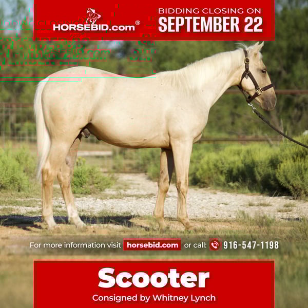 🍁𝒕𝒉𝒆 𝐅𝐀𝐋𝐋 𝑺𝒑𝒆𝒄𝒕𝒂𝒄𝒖𝒍𝒂𝒓🍁 Happening now thru MONDAY | SEPTEMBER 22nd - Available EXCLUSIVELY on HorseBid's website! For more details and to register visit: www.Horsebid.com CONSIGNOR CONTACT: Whitney Lynch 916-547-1198 LOCATION: Graham, TX BREED: Aqha REGISTERED: Yes REGISTERED NAME: CC Scoot A Lil Cash COLOR: Palomino HEIGHT: 13 AGE: 0 GENDER: Gelding “Scooter” is a barn favorite around here. He is full of personality and will be there first one to meet you at the gate. He will be an easy one to start and will be very trainable. I imagine he will finish out to be around 14.2 or so. Scooter picks up his feet, loads in trailer, good to bathe, etc. Check out his papers! He will be quick footed and catty. Located in Graham, TX Call me at (916)547-1198 **This horse has a very small hernia that will be fixed before he leaves.**