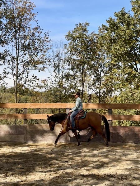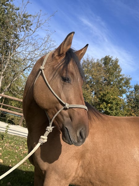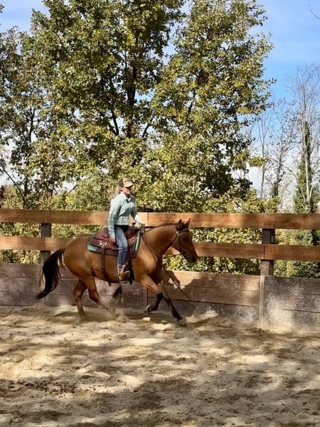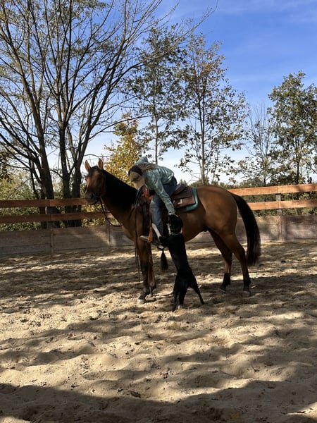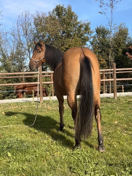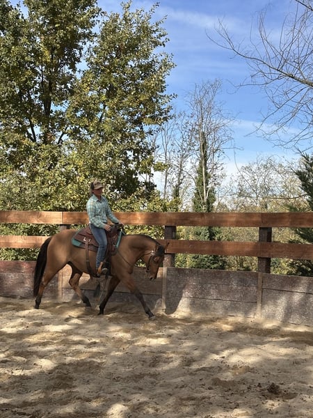 Beautiful Quarter Horse gelding with American registration. He has good flatwork and is very well-behaved on walks outdoors. Calm and balanced temperament, very cooperative and willing. Shod, he stands tied everywhere without issues and is excellent at traveling.