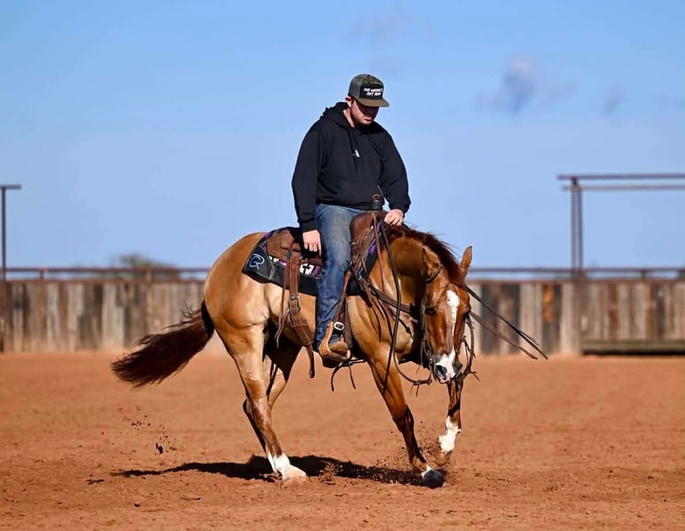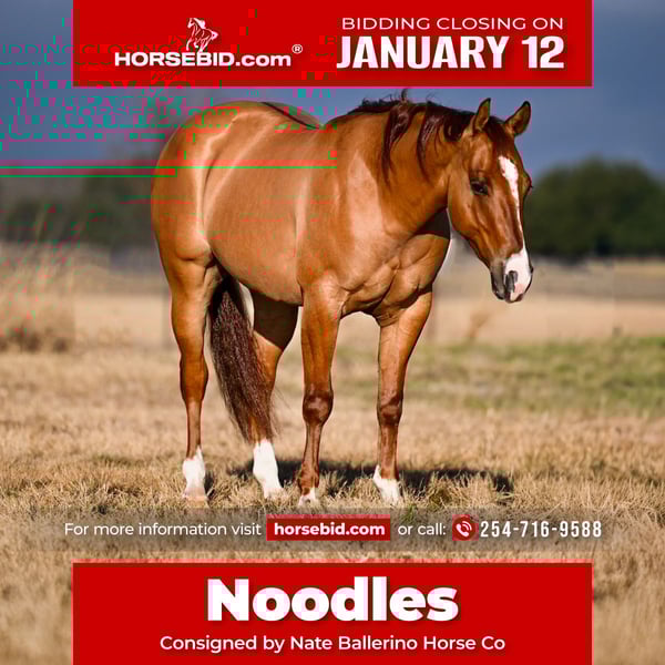 ♦️𝐍𝐄𝐖 𝐘𝐄𝐀𝐑'𝐒 𝑬𝒙𝒕𝒓𝒂𝒗𝒂𝒈𝒂𝒏𝒛𝒂♦️ Happening now thru MONDAY | JANUARY 12th - Available EXCLUSIVELY on HorseBid's website! For more details and to register visit: www.Horsebid.com CONSIGNOR CONTACT: Nate Ballerino Horse Co 254-716-9588 LOCATION: Waco TX BREED: Quarter horse REGISTERED: Yes REGISTERED NAME: Sonn of a gun COLOR: Dun HEIGHT: 14.1 AGE: 3 GENDER: Gelding This exceptional 3-year-old dun gelding is bred to be special and is absolutely proving it. He is by Gunners Tinseltown (LTE $307,000; Million Dollar Sire) and out of Magnum Chic Dream (NRHA Hall of Fame; $13.5 Million Dollar Sire), combining elite reining genetics with the mind and talent to go multiple directions. “Noodles” is extremely talented and on track, featuring a massive turnaround, a big, natural stop, and the ability to stay in frame naturally. He is athletic, smooth, and balanced, and he really enjoys a cow, showing plenty of natural feel and interest. Noodles has been pen roped on and shows all the makings of a standout heel horse or breakaway prospect with continued training. On top of his ability, he is very friendly, people-oriented, and easy to be around, making him a pleasure both in and out of the saddle. If you’re looking for a well-bred, young gelding with huge upside, a great mind, and versatility for the cow horse or rope horse world, this one checks all the boxes.