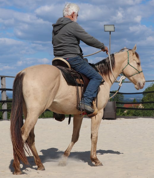 Zeb King Maxen - ein bildhübscher Quarter Horse Wallach, geboren am 2. Mai 2022. Mit seiner seltenen und außergewöhnlichen Farbe Amber Champagne Dun zieht er alle Blicke auf sich. Er wird ein geschätztes Endmaß von ca. 148 cm erreichen und ist kompakt, korrekt gebaut und stabil - mit vielversprechenden Proportionen, die ihn zu einem echten Allroundtalent machen. Zeb ist gesund, genetisch 6-Panel n/n über die Eltern und selbstverständlich altersgemäß geimpft und entwurmt. Er wächst in einer gemischten Herde im Offenstall auf, wo er unter besten Bedingungen viel Ruhe und Sicherheit erfahren durfte. Sein Charakter ist ebenso überzeugend wie sein Exterieur. Der Wallach zeigt sich menschenbezogen, neugierig, nervenstark und entspannt. Gleichzeitig ist er aufmerksam, lernwillig und mutig gegenüber neuen Aufgaben. Zeb ist artig, unkompliziert im Umgang, gut erzogen und lernt schnell - beste Voraussetzungen für eine zuverlässige Partnerschaft auf lange Sicht. Derzeit wird er behutsam und mit viel Gefühl nach den Grundsätzen des Natural Horsemanship auf sein Leben als Reitpferd vorbereitet. Er ist angeritten und zeigt sich dabei sehr brav und gelassen, auch im Gelände. Mit seiner guten Abstammung, seinem tollen Interieur und seiner Vielseitigkeit eignet sich Zeb ideal für Freizeit, Sport oder Turnier. Er ist ein echtes Nachwuchspferd mit Zukunft - ein treuer Partner, auf den man sich verlassen kann.