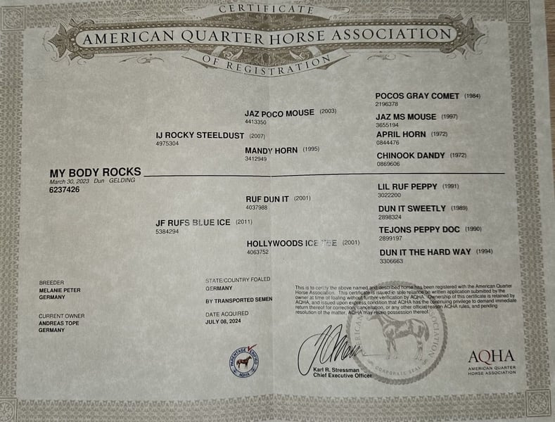 3 jähriger QH Wallach sucht seinen Menschen Zum Verkauf steht dieser hübsche 3 jährige Quarter Horse Wallach in der Traumfarbe Dun. „Buck“ ist ein großrahmiger im Ranch Horse Typ stehender junger Wallach mit unglaublich guter Gangqualität. Er ist aus der Zucht Green Maedows Ranch und durfte dort in einer verantwortungsvollen Aufzucht artgerecht groß werden. Das Jungpferde ABC kennt er bereits. „Buck“ ist ein sensibles und schüchternes Pferd für den wir seinen kompetenten Menschen suchen denn er braucht Zeit um sich zu öffnen und Vertrauen zu fassen. Er ist vom Boden aus gestartet und muss noch sehr viel lernen und braucht aufgrund seines jungen Alters noch einiges an Gewöhnung und Routine. Selbstverständlich geht er barfuß, ist regelmäßig geimpft und entwurmt. 5 Panel n/n. Weitere Infos gerne per Telefon 01704784208