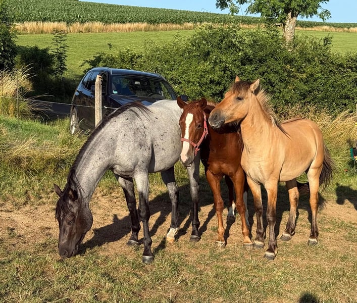 For sale is a very handsome, robust 2-year-old Quarter Horse gelding by Flamboyan Quixote. He has been raised with us in a herd environment and is very well-behaved. He is very easy to handle with a halter, loads without any issues, and cooperates calmly in all situations. He was recently gelded. He has never been ill and has always been kept in good health. With appropriate training, he will undoubtedly become an excellent partner for sport or leisure riding. 6-panel N/N No known health issues or allergies. An ultrasound examination (AKU) can be performed upon request. Please feel free to call or send a message to 0157 36803742. All information is provided without guarantee, subject to price changes. Transport is possible, online purchase available.