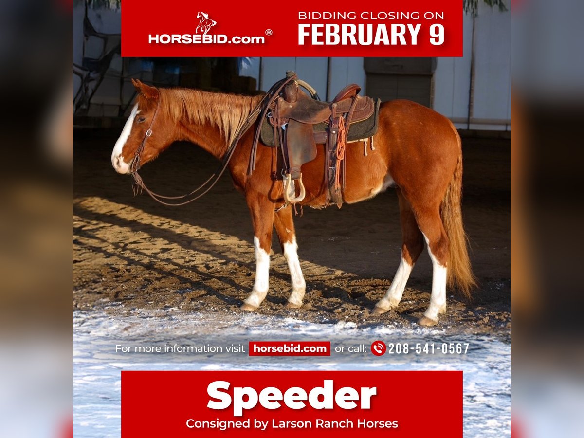 ❤️🔥𝑩𝒆 𝑴𝒊𝒏𝒆 𝐒𝐄𝐋𝐄𝐂𝐓❤️🔥 Happening now thru MONDAY | FEBRUARY 9th - Available EXCLUSIVELY on HorseBid's website! For more details and to register visit: www.Horsebid.com CONSIGNOR CONTACT: Larson Ranch Horses 208-541-0567 LOCATION: St. Anthony, ID BREED: Quarter Horse REGISTERED: No COLOR: Sorrel HEIGHT: 14.3 AGE: 3 GENDER: Gelding Speeder is an exceptional 3 yr old gelding that has as much chrome as he does character. He’s a gentleman with a loving demeanor making him safe for the family to be around. Speeder stands around 14.3-15hh, is easy on the eyes, and a joy to be around. He’s no stranger when it comes to work. On the ranch, he’s been used in many different environments and situations from checking and trailing cows, to shipping pairs, doctoring, or exploring rugged country. He’s one who always aims to please. Speeder knows how to maneuver his way around rocks, logs, brush, bridges, and other obstacles, and does so with confidence and ease. In the arena, Speeder is extremely soft really supple in the face and throughout his whole body, and is a super pretty mover ready for someone to make him their next ranch rider. He carries his lead low, and travels on a loose rein. He wants to ride slow, safe, and balanced. Speeder collects up nicely, picks up his leads has a great stop and is starting to spin. He’s tracked the smarty, and cows in the pasture, as well as has been started ranch roping in the pasture. Speeder has been desensitized to different whips, tarps, noodles, flags, plastic bags, ropes, cars, etc... helping to make him a safe and confident citizen. He’s handsome, and easy to be around. Speeder is extremely user friendly, and has been handled and rode by all levels of riders. His quiet mind, and willingness to please is what sets him apart and makes him the perfect candidate for any soul searching for a life long partner and friend. Whether you’re looking to capture the emotions of the crowd carrying a flag, trail riding with friends, ranching, or looking for your next show horse, Speeder is one who catches the eyes of those around him, and who has the whole package and disposition to get you noticed. References and Testimonials Available Comes with a current and Passed PPE