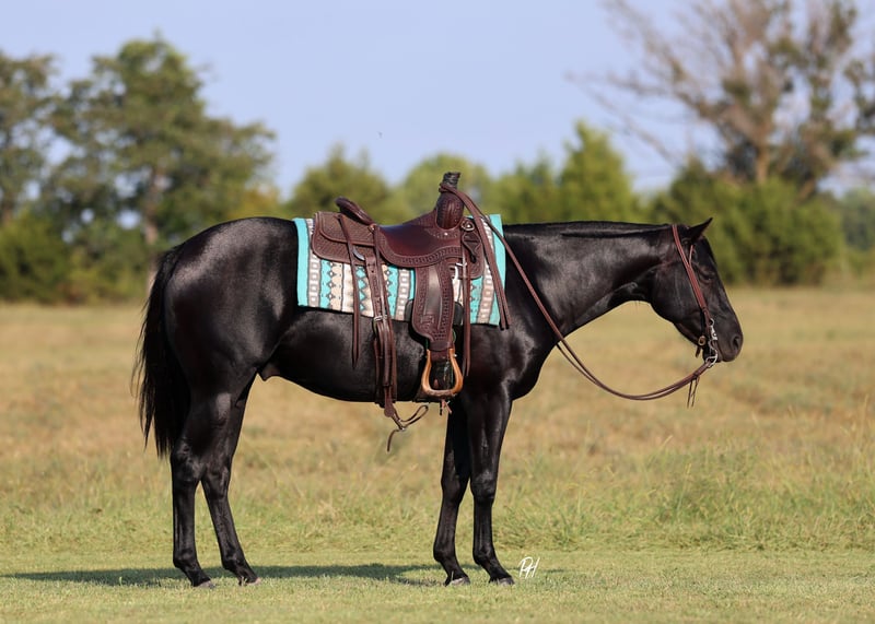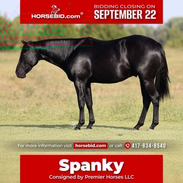 🍁𝒕𝒉𝒆 𝐅𝐀𝐋𝐋 𝑺𝒑𝒆𝒄𝒕𝒂𝒄𝒖𝒍𝒂𝒓🍁 Happening now thru MONDAY | SEPTEMBER 22nd - Available EXCLUSIVELY on HorseBid's website! For more details and to register visit: www.Horsebid.com CONSIGNOR CONTACT: Premier Horses LLC 417-834-8540 LOCATION: Buffalo, Missouri BREED: Quarter Horse REGISTERED: Yes REGISTERED NAME: Spankin Fame COLOR: Black HEIGHT: 15 AGE: 2 GENDER: Gelding Spankin Fame is one of the classiest geldings you will ever come across and guaranteed to make you do a double take. You could not put together a more perfect young gelding. He is pretty headed, nice shoulder, and big hipped. Spanky is stout made with a lot of bone throughout and hard black feet. He has a long mane and a thick tail. Spanky is sired by Sycamore Lane LTE: $21,000+ and PE: $350,000+ with limited foal crop. Sycamore Lane is also a full sibling Woodbridge PE: $650,000+. His dam, Kayces Moon Candoo, is a daughter of Freckles Candoo who qualified for the AQHA World Show in 5 separate events. He is the perfect cross that showcases athleticism, brains, and flawless confirmation. He is Future Fortunes, BRIF, VGBRA, Colorado Classic, and Select Stallions eligible. Spanky has been in our family since just right before he turned 1 year old, so we have owned him just shy of 2 years. What an absolute joy he has been to raise and get to this point. One word that I’ve continually associated with him is, easy. Everything I have thrown at him he takes it in stride, no matter how ridiculous it is. As a yearling I would pony him off seasoned horses or off the side by side. I took him across the obstacles, loaded and taught him to back out of the trailer, and handled him on a weekly basis. All of that work has transitioned beautifully since he has been started under saddle and ridden consistently. Spanky has a smooth trot and most comfortable rocking chair lope, picking his leads up easily. He naturally wants to stop deep and on his hind end. He is starting to turnaround,side pass, and will break at the poll. Spanky goes over any and all obstacles such as; teeter totter, bridges, logs, tires, etc. Go check the mail or head down the road on him, he is traffic safe. He goes through water and is patient going down embankments. Not much phases him, he is very much an old soul. Spanky is very personable and loves people, especially if you have treats then he is your best friend. Super easy to catch, he lives out on 15 acres of pasture, so I usually take the side by side to catch him. He gets along good with other horses. He is an easy keeper and stalls good. He is UTD on dental, coggins, trimming, and worming. Clean and current X-rays done on 09/10/2025. Spanky has been well loved and in the best of care. He is going to make a top notch performance gelding one day, no matter which direction you want to go. Spanky could do barrels, roping, ranch, trail, etc. He has so much try and is very talented. The sky is literally the limit with him and we are proud to offer him, so do not miss your chance!