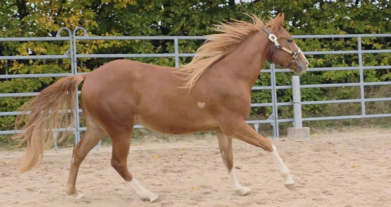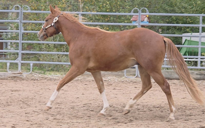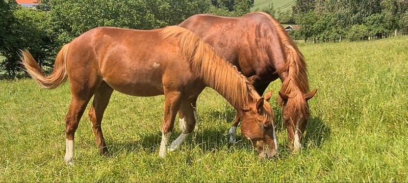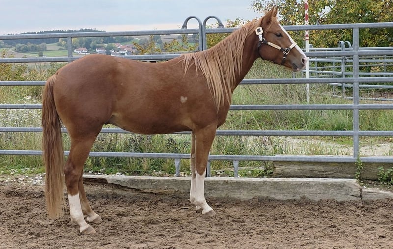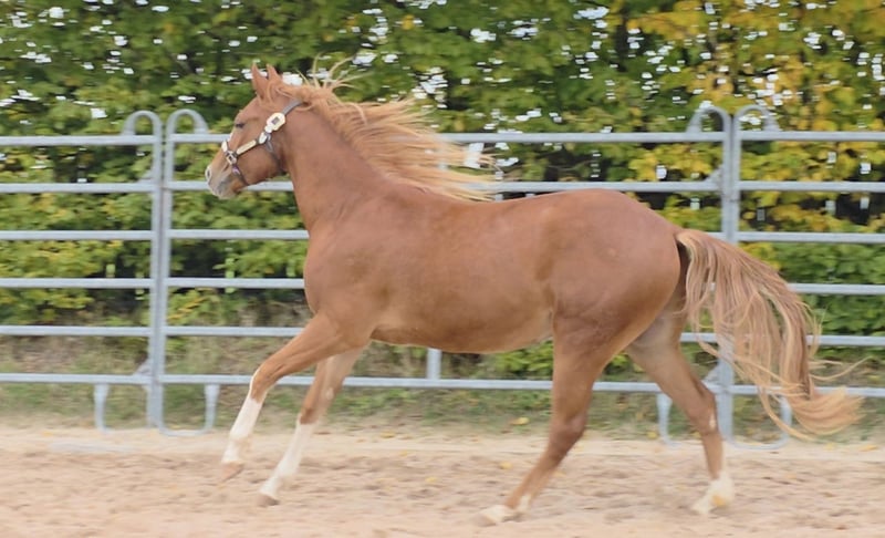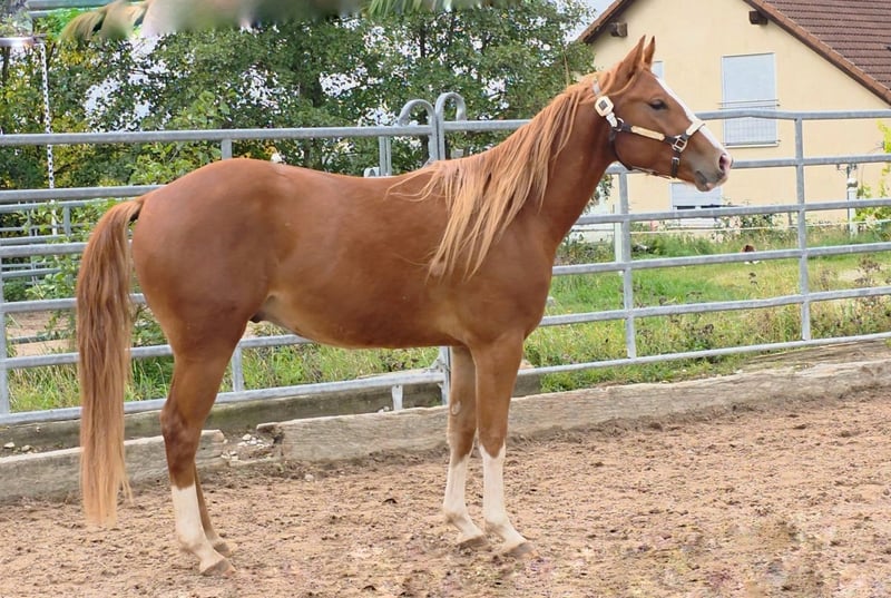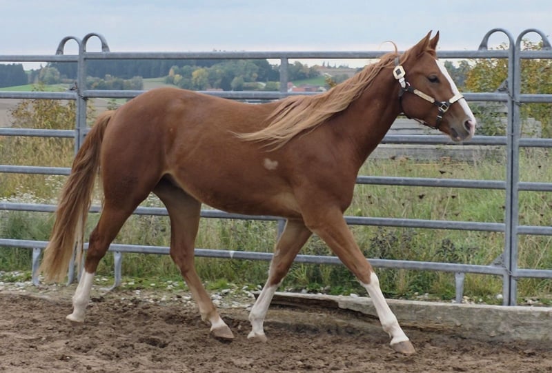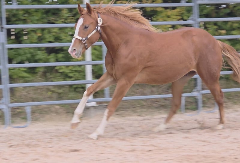 HES A RUF SHINER aka "Arkadi" am 24.03.2023 wurde der kleine fuchsfarbene Hengst geboren Wie seine Halbbrüder hat er leicht flachse Mähne und Schweif und trägt das Rabicano Gen in der Form eines kleinen Herzens auf der rechten Seite.. das ist wirklich aussergewöhnlich Sein Papa One Shiney Treat ist direkter Sohn von Shining Spark SIRE : Shining Spark ($ 10.6 Million Sire) DAM: Hagandaz (LTE $49,289 in NCHA & NRCHA, OE $65.616 in NRHA, NCHA& NRCHA) (Grays Starlight x Doc O Lena) Seine Mutter Sailin Jumping Joana Tochter von Sailin Ruf SIRE Sailin Ruf - LiL RUF PEPPY 3 Million Dollar Sire Peppy San Badger AQHA & NCHA Hall of Fame (2008) aus einer etwas unbekannteren Mutterlinie die auf DOC LYNX (NCHA LTE: $4,716,808.10) gezogen ist ⭐️ 6 Panel: N/N Seine Halbbrüder von Smartest Little Cat waren herausragend und als Fohlen von der DQHA mit 1A prämiert. Arkadi hat ein selbstbewusstes freches Wesen. Er ist neugierig und tempramentvoll und selbstbewusst und er zeigt jetzt schon sein enormes Bewegungs Potential, Ist schnell und ausbalanciert. und ein schönes kräftiges und korrektes Fundament und er ist sehr harmonisch bemuskelt. so wie er derzeit gewachsen ist vermuten wir das es größer als 150 wird. vermutlich ~153cm Hier auf Hof Eichelbrunn wächst er in unserer BubenGruppe auf. Dort seigt er sich als sehr selbstbewusst aber respektiert auch die Ansage der Älteren. Beim einem Hoftermin haben die One Shiney Treat Nachkommen sehr überzeugt und es gab für alle 3 vorgestellten eine 1A Bewertung zwischen 80,41 und 85,34... das spricht für sich und für die Qualität der Nachzucht von diesem tollen Shining Spark Sohn. Er kann jederzeit mit Papieren COR und deutschem DQHA Equidenpass ausziehen. wie alle unsere jungen Perde Tetanus geimpft und regelmässige Hufbearbeitung. DQHA Futurity einbezahlt. Ein vielversprechendes Nachwuchs Pferde für den ambitionierten Sport und Freizeitreiter! Seit dem 24.03.2025 ist Arkadi nun glücklicher Wallach. und natürlich freut er sich seine Sachen zu packen und neuen Aufgaben entgegenzugehen. Besuche sind nach Absprache jederzeit möglich