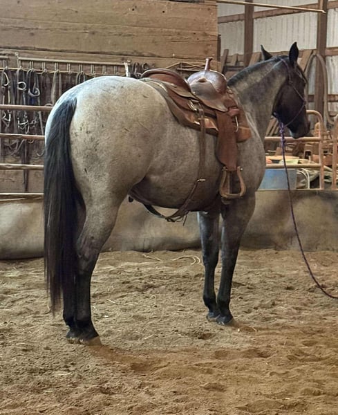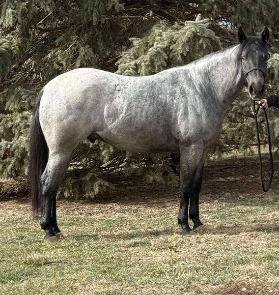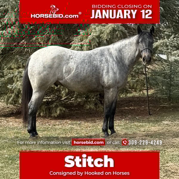 ♦️𝐍𝐄𝐖 𝐘𝐄𝐀𝐑'𝐒 𝑬𝒙𝒕𝒓𝒂𝒗𝒂𝒈𝒂𝒏𝒛𝒂♦️ Happening now thru MONDAY | JANUARY 12th - Available EXCLUSIVELY on HorseBid's website! For more details and to register visit: www.Horsebid.com CONSIGNOR CONTACT: Hooked on Horses 309-229-4249 LOCATION: Princeville il BREED: Quarter/percheron draft cross REGISTERED: No REGISTERED NAME: Stitch COLOR: Blue roan HEIGHT: 15.2 AGE: 3 GENDER: Gelding Stitch May 31, 2023 blue roan gelding His sire is Pocos Star Bartender by Wimpys Poco Star. His dam is a Percheron draft. This colt has a ton of personality, extremely smart, athletic and the best laid-back attitude you could ask for. He stands 15.2 and growing, weighing about 1400 lbs. He’s up to date on everything and passes PPE with flying colors. He’s content inside or outside riding. He will go all day and do anything asked of him. He’s eager to please and never spokes or jumps at new things. I’ve had him on miles of trails, by himself and in groups. He’s had constant hours in the arena as well. He know his manners, he knows his leads, he has all his fundamentals down. Stitch is collected in his gaits and stops on slack. He takes both leads and has smooth transition. He absolutely is a people horse and loves new things. No scars, no blemish and no issues. He loads, ties, saddles great. He rides the same with time off. He is an in your pocket type and easy to catch. I love this colt so much, he definitely is a hugger and will make you smile.