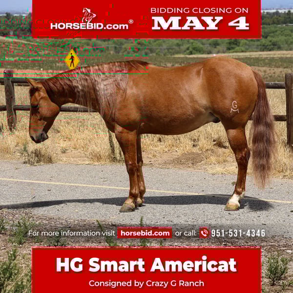 ▪️▫️◾️𝐭𝐡𝐞 𝑴𝒂𝒚 𝐒𝐞𝐥𝐞𝐜𝐭◾️▫️▪️ Happening now thru MONDAY | MAY 4th - Available EXCLUSIVELY on HorseBid's website! For more details and to register visit: www.Horsebid.com CONSIGNOR CONTACT: Crazy G Ranch 951-531-4346 LOCATION: Norco, CA BREED: Quarter horse REGISTERED: Yes REGISTERED NAME: HV Smart Americat COLOR: Red dun HEIGHT: 14 AGE: 4 GENDER: Gelding Registered 2022 Dun Gelding – “Slick” Meet Slick — a sharp, young gelding with a great mind and all the right tools to go in any direction. Standing right at 14 hands, he’s the perfect size with a solid, athletic build. Slick is bred for reining and cow work, and it shows in everything he does. He’s naturally cowy, gritty, and quick-footed with the kind of instinct you want in a performance horse. He is started on the heel side and showing tons of promise. With his natural ability and foundation, he would make a standout breakaway horse or continue progressing nicely as a heel horse. On top of his talent, Slick is as safe and kind as they come. He’s kid and grandma safe, gentle to handle, and has excellent ground manners. He’s the same horse every ride — quiet, willing, and easy to get along with. Out on the trail, Slick shines. He’s been exposed to it all and handles it like a pro: * Tarps * Bags * Barking dogs * Trail obstacles He has little to no spook, making him a dependable partner whether you’re in the arena or out riding. Slick is the kind of young horse that checks every box — safe, talented, well-bred, and broke with a great attitude. He’s sweet-natured, easy to be around, and ready to keep advancing with his next owner. 📍 Don’t miss out on this versatile, all-around gelding.