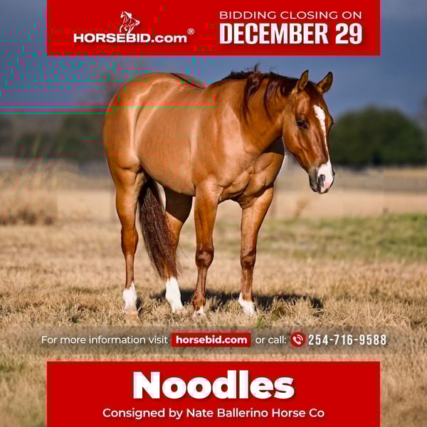 ⚜️ 𝓗𝓮𝓻𝓲𝓽𝓪𝓰𝓮 𝐖𝐢𝐧𝐭𝐞𝐫 𝓒𝓵𝓪𝓼𝓼𝓲𝓬⚜️ Happening now thru MONDAY | DECEMBER 29th - Available EXCLUSIVELY on HorseBid's website! For more details and to register visit: www.Horsebid.com CONSIGNOR CONTACT: Nate Ballerino Horse Co 254-716-9588 LOCATION: Waco TX BREED: Quarter horse REGISTERED: Yes REGISTERED NAME: Sonn of a gun COLOR: Dun HEIGHT: 14.1 AGE: 3 GENDER: Gelding This exceptional 3-year-old dun gelding is bred to be special and is absolutely proving it. He is by Gunners Tinseltown (LTE $307,000; Million Dollar Sire) and out of Magnum Chic Dream (NRHA Hall of Fame; $13.5 Million Dollar Sire), combining elite reining genetics with the mind and talent to go multiple directions. “Noodles” is extremely talented and on track, featuring a massive turnaround, a big, natural stop, and the ability to stay in frame naturally. He is athletic, smooth, and balanced, and he really enjoys a cow, showing plenty of natural feel and interest. Noodles has been pen roped on and shows all the makings of a standout heel horse or breakaway prospect with continued training. On top of his ability, he is very friendly, people-oriented, and easy to be around, making him a pleasure both in and out of the saddle. If you’re looking for a well-bred, young gelding with huge upside, a great mind, and versatility for the cow horse or rope horse world, this one checks all the boxes.