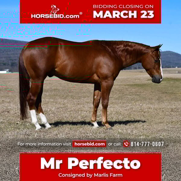 ⚜️𝓽𝓱𝓮 𝐆𝐎𝐋𝐃 𝓢𝓮𝓵𝓮𝓬𝓽⚜️ Happening now thru MONDAY | MARCH 23rd - Available EXCLUSIVELY on HorseBid's website! For more details and to register visit: www.Horsebid.com CONSIGNOR CONTACT: Marlis Farm 814 777 0607 LOCATION: Rebersburg, PA BREED: Quarter horse REGISTERED: Yes REGISTERED NAME: TR Isnt He Perfect COLOR: Sorrel HEIGHT: 14.1 AGE: 4 GENDER: Gelding If you’re looking for a talented, safe, and eye-catching horse that the whole family can enjoy, meet TR Isn’t He Perfect, affectionately known around the barn as “Mr Perfecto.” Mr Perfecto is a 4-year-old, 14.1 hand sorrel AQHA gelding that truly lives up to his name. He is an son of Walla Walla Whiz and out of a daughter of Gunner, He is a finished reiner with a solid handle and excellent training, making him both fun and easy to ride. He is well broke, gentle, and extremely user-friendly, with the kind of disposition that makes him suitable for riders of all experience levels. This gelding is safe, sane, and sound, with a quiet and willing personality. He has the talent to perform while still being forgiving enough that he can make a beginner rider look like a professional. Mr Perfecto has been ridden in town and up in the mountains, proving he’s confident, reliable, and versatile outside the arena as well. With his pretty sorrel color, good build, and calm demeanor, he would make an excellent youth show horse or a dependable family mount. Whether you’re looking to compete, trail ride, or simply enjoy a well-trained horse, Mr Perfecto is ready to be someone’s perfect partner. For more information or to come meet Mr Perfecto, call Mark at 814-777-0607 (call only). We can help arrange shipping anywhere!