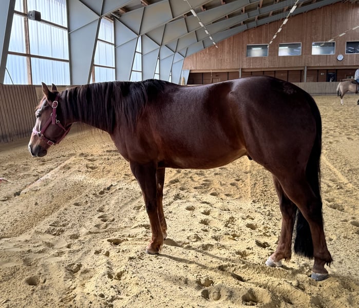 Verkaufe American Quarter Horse Wallach, geb. 2022, in wunderschönem Dunkelfuchs. Mit einem Stockmaß von 146 cm ist er perfekt für den ambitionierten Reining /Ranch Riding oder Freizeit Reiter, der ein junges, vielversprechendes Pferd sucht. Der Wallach wurde mit 3 Jahren gestartet er ist gut geritten und zeigt bereits erste vielversprechende Ansätze für den Sport. Seine solide Grundausbildung sowie sein freundliches Wesen machen ihn zu einem zuverlässigen Partner. Ein echtes Talent, das noch viel Potential für die Zukunft bietet. Bei Interesse stehe ich gerne für weitere Informationen und eine Besichtigung zur Verfügung.
