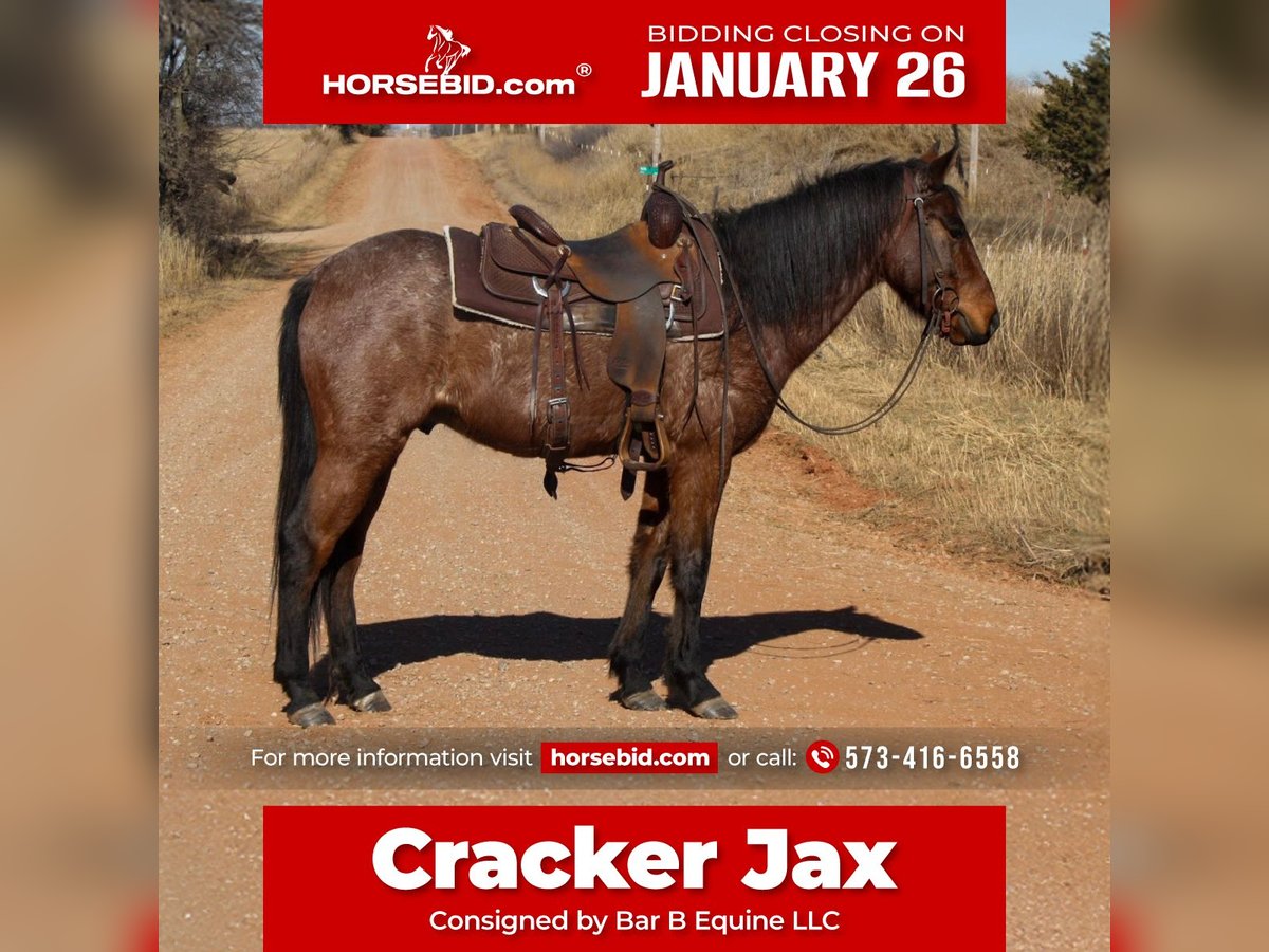 𝐉𝐀𝐍𝐔𝐀𝐑𝐘 ⭐️𝑨𝒍𝒍 𝑺𝒕𝒂𝒓 𝑳𝒊𝒏𝒆𝒖𝒑⭐️ Happening now thru MONDAY | JANUARY 26th - Available EXCLUSIVELY on HorseBid's website! For more details and to register visit: www.Horsebid.com CONSIGNOR CONTACT: Bar B Equine LLC 573-416-6558 LOCATION: Owensville, MO BREED: QH X REGISTERED: No COLOR: Bay Roan HEIGHT: 14.2 AGE: 4 GENDER: Gelding Cracker Jax is a 4 year old 14.2 hand bay roan crossbred gelding. Jax has been ranched on nearly every day in the wide Oklahoma country, chasing wild horses and gathering cattle from all ends of the pasture. When needing to unmount for any reason, you don’t even need to worry about tying! Jax is a seasoned veteran in the ground tying aspect. He is a horse I never have to worry about being any different than he was the day before. He has shown his true color to us time and time again, and that color is striking gold through a bay roan coat! If plodding around cattle isn’t quite your criteria, Cracker Jax has been ridden English in and out of the arena as well. Going down the trails and over the jumps, he’s proven himself capable of all! Speaking of arena, Jax shows heavy interest in arena work, picking up each lead with ease and having one of the smoothest one step short lopes I’ve ever ridden! He has been played around with on the barrels and poles, and has been hauled to several playdays/funshows. In the pasture, Jax gets along with others well and sets lower on the totem pole. He has been pastured with a variety of different animals including mares, geldings, young horses, donkeys, goats, and even a zedonk! Jax also does not mind your typical farm animals such as dogs, cats, or chickens. He is not fearful of loud noises like machinery or vehicles and has been deemed traffic safe! Cracker Jax enjoys the trails and will cross any obstacle placed in front of him. He is no stranger to deep waters and steep inclines. This young horse has handled everything with total ease and confidence, and truthfully we hate to see him go! But, we are excited to see what setting Jax ends up in and how many smiles are to come with! If you’re looking for an honest, young horse to end your search- Jax fits all the requirements for any styled rider. Any questions big or small, please reach out!
