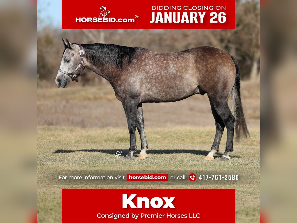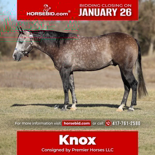 𝐉𝐀𝐍𝐔𝐀𝐑𝐘 ⭐️𝑨𝒍𝒍 𝑺𝒕𝒂𝒓 𝑳𝒊𝒏𝒆𝒖𝒑⭐️ Happening now thru MONDAY | JANUARY 26th - Available EXCLUSIVELY on HorseBid's website! For more details and to register visit: www.Horsebid.com CONSIGNOR CONTACT: Premier Horses LLC 417-761-2580 LOCATION: Buffalo, Missouri BREED: Quarter Horse REGISTERED: Yes REGISTERED NAME: No Gutts No Glory *Son of Spooks Gotta Whiz* COLOR: Gray HEIGHT: 14.3 AGE: 4 GENDER: Gelding Known around the barn as Knox, this exceptional gelding is the kind that makes you stop in your tracks the moment he walks by. No Gutts No Glory is a striking, well-bred gelding with the kind of pedigree, presence, and ability that immediately sets him apart. He is by the legendary Spooks Gotta Whiz (LTE $345,137.98; PE $13.5 Million) and out of the proven mare Gunners Glory (LTE $54,940.85; PE $114,029.04), offering elite earning power on both sides of his pedigree. An eye-catching iron gray with dapples throughout, he is beautifully made with a long, thick mane and tail, two neat white socks, and an adorable, refined face. Knox spent his 3-year-old year in the McCutcheon’s pristine program, receiving a correct, professional foundation and developing into a confident, willing partner. He performs all the maneuvers with ease, including correct, satisfactory spins, pretty balanced circles, a big powerful stop, and smooth lead changes. A naturally beautiful mover, he offers a ground-covering extended trot that makes him especially exciting for ranch trail, ranch riding, and versatility classes. Beyond the arena, Knox is exceptionally versatile and user-friendly. He trail rides confidently, travels through water and creek beds, crosses logs, goes up and down embankments, and handles obstacles with ease. He is comfortable crossing bridges, checking the mailbox, and stepping onto raised platforms, showing a quiet, willing mind and a great work ethic. Whether your goals are in the reining pen, ranch classes, or simply owning a standout gelding that is as capable as he is beautiful, this one truly checks every box. ✔️ Knox passed a pre-purchase exam on 1/15/2026.