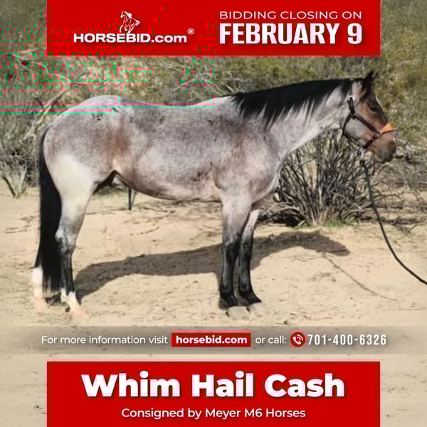 ❤️🔥𝑩𝒆 𝑴𝒊𝒏𝒆 𝐒𝐄𝐋𝐄𝐂𝐓❤️🔥 Happening now thru MONDAY | FEBRUARY 9th - Available EXCLUSIVELY on HorseBid's website! For more details and to register visit: www.Horsebid.com CONSIGNOR CONTACT: Meyer M6 Horses 701-400-6326 LOCATION: Caldwell, ID BREED: Quarter Horse REGISTERED: Yes REGISTERED NAME: WHIM HAIL CASH COLOR: Bay Roan HEIGHT: 15 AGE: 4 GENDER: Gelding This gelding has a solid mind, easy mover, and has a run/cow pedigree sure to be a serious athlete. Has been trained and roped on by Jake Telford and is ready to enter in the heading box. Handles the box, tracks cattle, and scores well. His sire, Hail Cat, has lifetime earnings over $43,000 in the reined cow horse and team roping. Approximately 15.1 hands and is eligible for the Royal Crown Roping. For more information, contact Jake at 208-890-1205.