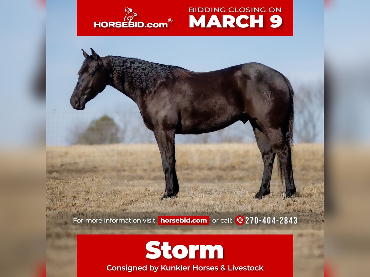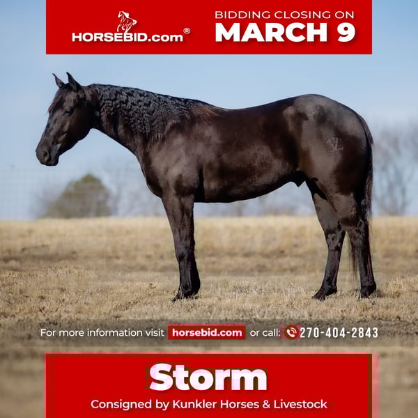 ℳ𝒶𝓇𝒸𝒽 ♦️𝐑𝐈𝐃𝐄𝐑'𝐒 𝐂𝐇𝐎𝐈𝐂𝐄♦️ Happening now thru MONDAY | MARCH 9th - Available EXCLUSIVELY on HorseBid's website! For more details and to register visit: www.Horsebid.com CONSIGNOR CONTACT: Kunkler Horses & Livestock 270-404-2843 LOCATION: Tompkinsville, KY BREED: AQHA REGISTERED: Yes REGISTERED NAME: LC GYPSY FRITZ 536 COLOR: Black HEIGHT: 15 AGE: 4 GENDER: Gelding Storm is an outstanding gelding. He is built to last. He’s down to earth and very gentle! Storm has been on many trail rides. He’s also spent a lot of time in the arena. Storm takes his leads he side passes and has a nice reverse. Storm has seen a lot of live cattle you can rope off his back. He’s started in the box on both sides, He is not hot, He’s level-headed when asked to do a job! Storm has been used around the farm checking fences as well as cow calf pairs on a daily basis! Storm is a solid gelding that you can trust. He’s soft and responsive to leg pressure. He also has a nice neck rein on him! The storm will pick you up off any object to mount he stands still while mounting! Storm is a family type gelding. If you're looking for a partner to blaze this wildlife with, he’s your man! Storm has a full set of X-rays and a full PPE on file! Storm is quiet in his stall. He does not crib or weave! Storm is a big stout gelding that we guarantee you will enjoy every second of it! Thank you for considering Storm as your forever partner!