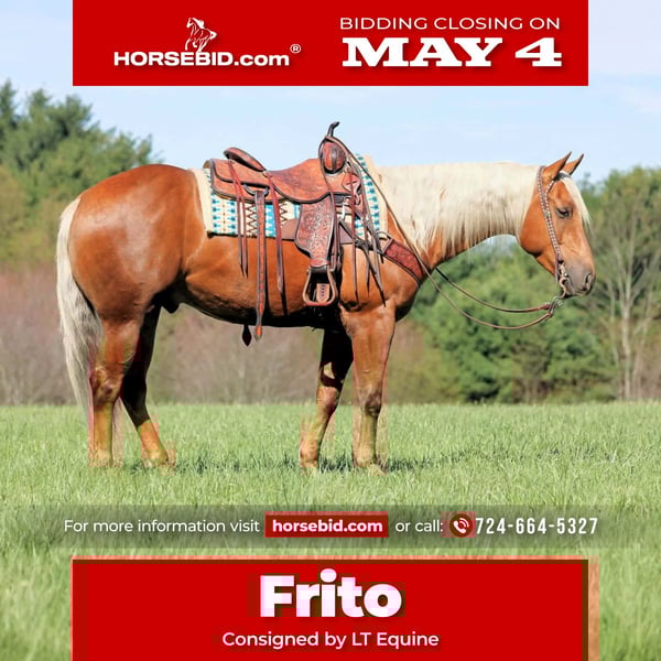 ▪️▫️◾️𝐭𝐡𝐞 𝑴𝒂𝒚 𝐒𝐞𝐥𝐞𝐜𝐭◾️▫️▪️ Happening now thru MONDAY | MAY 4th - Available EXCLUSIVELY on HorseBid's website! For more details and to register visit: www.Horsebid.com CONSIGNOR CONTACT: LT Equine 724-664-5327 LOCATION: Miola, PA BREED: AQHA REGISTERED: Yes REGISTERED NAME: Leo’s Fast Frenchman COLOR: Sooty Palomino HEIGHT: 15 AGE: 4 GENDER: Gelding Leo’s Fast Frenchman “Frito” is a standout young gelding with the looks, mind, and versatility to go in any direction you choose. This 4-year-old AQHA gelding stands 15 hands tall and turns heads everywhere he goes with his rare and eye-catching dark sooty palomino color, paired with a long, thick mane and tail. With bloodlines tracing back to the legendary Frenchman’s Guy, Frito has both the pedigree and the potential to excel. Frito has been started the right way and has a solid, well-rounded foundation. He has been used around the farm for pushing cattle, checking pastures, and handling day-to-day tasks, and has even had a rope thrown off him. He rides off leg pressure, moves his shoulders willingly, and has a nice collected jog and an easy, comfortable lope. He is coming along nicely on a neck rein and is a forgiving, user-friendly ride. On the trails, Frito has been ridden both alone and in groups, and handles new environments with a willing attitude. He is suitable for a less experienced rider with some guidance, yet still has enough talent and “buttons” to keep a more experienced rider engaged. He has also been ridden English and has been started over cross rails, where he showed a natural willingness and ability. Frito’s versatility makes him an excellent prospect for a wide range of disciplines. He would make a fantastic all-around 4H horse, with the potential to go on in barrels, poles, ranch work, English events, or simply be a dependable trail partner. Beyond his abilities, Frito is the kind everyone wants in their barn—an in-your-pocket gelding with a big, lovable personality. He enjoys attention, is easy to catch, and is a pleasure to be around. If you’re looking for a young horse with a great start, a willing mind, and the ability to go in any direction, Frito is one you don’t want to miss. Frito has a current coggins, and basic health exam, 4 new shoes and is ready to ride! He will carry 2 small scars one on his neck and one on his leg from an old fence injury. It doesn’t bother him at all. (They will be shown in his video) For any more information or questions if you and Frito would make a good team don’t hesitate to call or text! We can help arrange shipping if needed!