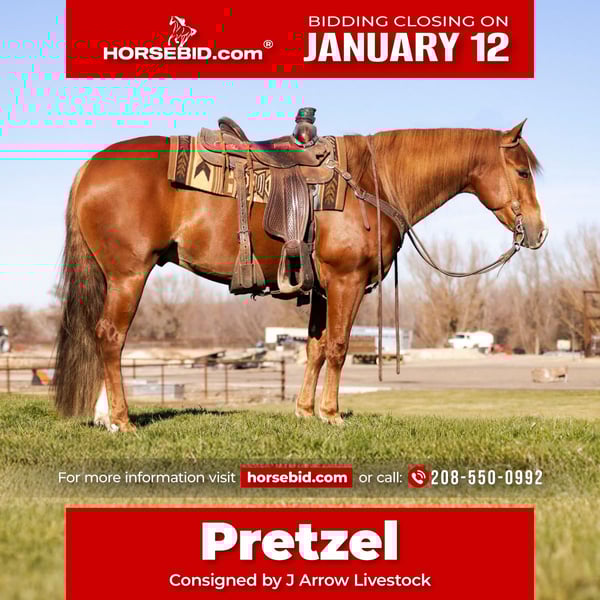 ♦️𝐍𝐄𝐖 𝐘𝐄𝐀𝐑'𝐒 𝑬𝒙𝒕𝒓𝒂𝒗𝒂𝒈𝒂𝒏𝒛𝒂♦️ Happening now thru MONDAY | JANUARY 12th - Available EXCLUSIVELY on HorseBid's website! For more details and to register visit: www.Horsebid.com CONSIGNOR CONTACT: J arrow livestock 208-550-0992 LOCATION: Caldwell, ID BREED: AQHA REGISTERED: Yes REGISTERED NAME: Voodoo it again COLOR: Sorrel HEIGHT: 15 AGE: 4 GENDER: Gelding A drop dead gorgeous gelding pretzel will turn heads and make a big impression when he walks in the gate. This gelding has had two years of reining training and is a nrha money earner with limited showing. Pretzel is a beautiful loper low headed and has great speed control. He’s a big stopping horse that will stop on any ground. Super nice horse to be around he is very well mannered with a big personality. He likes attention and loves to be petted and groomed. Pretzel will stand tied quietly in cross ties or solid to a fence he’s not one bit spoiled. He hauls super well doesn’t paw or kick. No bad stall habits. Pretzel is good to ride outside and really enjoys it. We have also started working cattle on him and he loves it I think he’d make a rope horse overnight. He is a really good moving horse that could go in any direction. Zero vices sells sound. By shiners voodoo dr nrha 6 million dollar sire. Please call fmi 208 550 0992