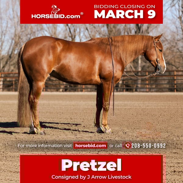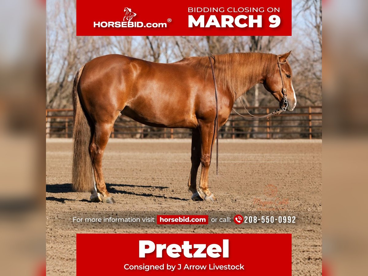 ℳ𝒶𝓇𝒸𝒽 ♦️𝐑𝐈𝐃𝐄𝐑'𝐒 𝐂𝐇𝐎𝐈𝐂𝐄♦️ Happening now thru MONDAY | MARCH 9th - Available EXCLUSIVELY on HorseBid's website! For more details and to register visit: www.Horsebid.com CONSIGNOR CONTACT: J arrow livestock 208-550-0992 LOCATION: Caldwell, ID BREED: AQHA REGISTERED: Yes REGISTERED NAME: Voodoo it again COLOR: Sorrel HEIGHT: 15 AGE: 4 GENDER: Gelding A drop dead gorgeous gelding pretzel will turn heads and make a big impression when he walks in the gate. This gelding has had two years of reining training and is a nrha money earner with limited showing. Pretzel is a beautiful loper low headed and has great speed control. He’s a big stopping horse that will stop on any ground. Super nice horse to be around he is very well mannered with a big personality. He likes attention and loves to be petted and groomed. Pretzel will stand tied quietly in cross ties or solid to a fence he’s not one bit spoiled. He hauls super well doesn’t paw or kick. No bad stall habits. Pretzel is good to ride outside and really enjoys it. We have also started working cattle on him and he loves it I think he’d make a rope horse overnight. He is a really good moving horse that could go in any direction. Zero vices sells sound. By Shiners Voodoo Dr NRHA 6 million dollar sire. Please call fmi 2085500992
