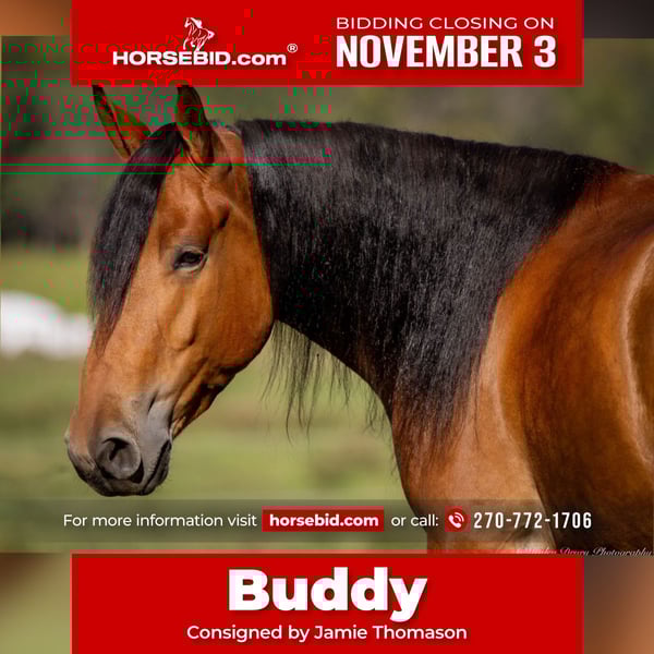 ⚜️𝐓𝐇𝐄 𝐅𝐀𝐋𝐋 𝐇𝐄𝐑𝐈𝐓𝐀𝐆𝐄 𝐂𝐋𝐀𝐒𝐒𝐈𝐂⚜️ Happening now thru MONDAY | NOVEMBER 3rd - Available EXCLUSIVELY on HorseBid's website! For more details and to register visit: www.Horsebid.com CONSIGNOR CONTACT: Jamie Thomason 270-772-1706 LOCATION: Auburn, KY BREED: Belgian/Quarter Horse Cross REGISTERED: No REGISTERED NAME: BUDDY COLOR: Bay HEIGHT: 15.2 AGE: 3 GENDER: Gelding He’s ready to be your next Buddy! Gentle, quiet, and friendly — the kind that greets you at the gate and always aims to please! A young crossbred gelding with the foundation to advance in the discipline of your choice! Buddy is a 3 yr old, Belgian/Quarter Horse cross gelding, currently standing 15.2. With a rich bay coat, long flowing mane, and a kind expression, he’s just as easy on the eyes as he is to be around. Buddy has been trail ridden through state and national parks by myself, my daughter, & her friends. He confidently tackles hills, water crossings, & bridges. Rides across open pastures and down wooded paths. Buddy has been started in the arena, he walks, trots, and canters both directions on the correct lead. Around the farm, he’s been used to move cattle and works comfortably alongside stock dogs. He is accustomed to daily life on the farm and is unbothered by farm machinery, UTV’s, and other livestock. Buddy can be stalled or is perfectly content turned out in a mixed herd. He’s always easy to catch, stands tied or cross-tied, and loads and hauls without issue. With his calm mind, solid foundation, and great start in both trail and arena work, Buddy is the kind of young gelding who’s ready to step into your life and become that dependable partner everyone hopes for — your next Buddy! If you would like to meet Buddy or have any additional questions, feel free to reach out! He sells current on all cares & we can assist in arranging shipping to anywhere!