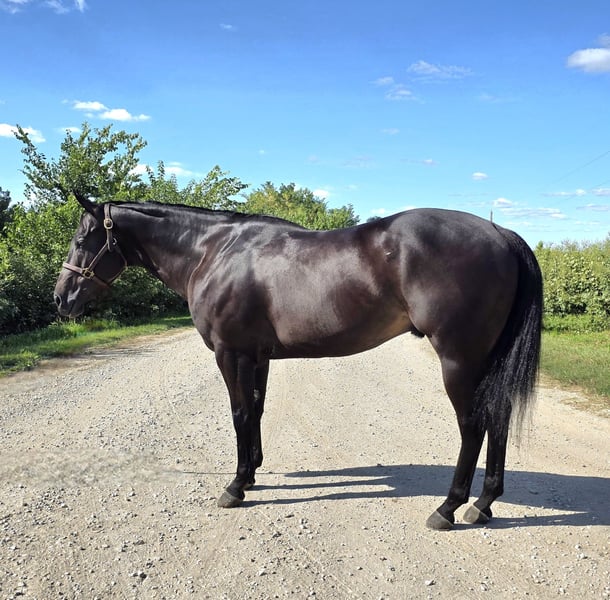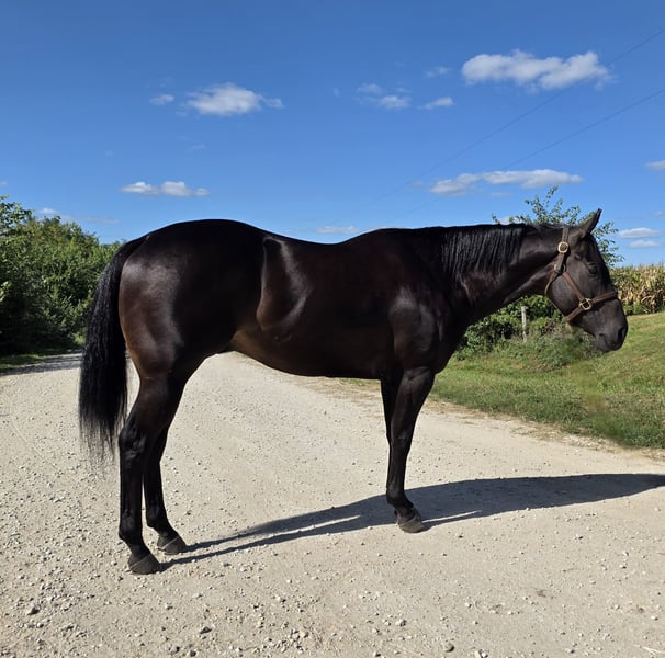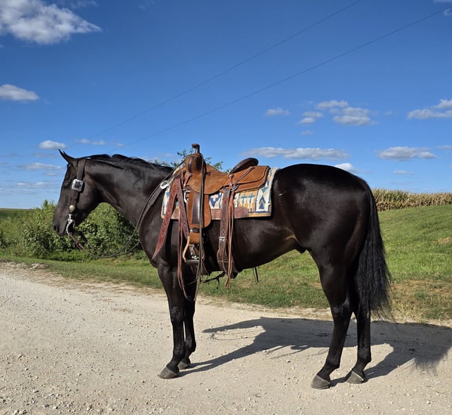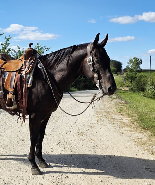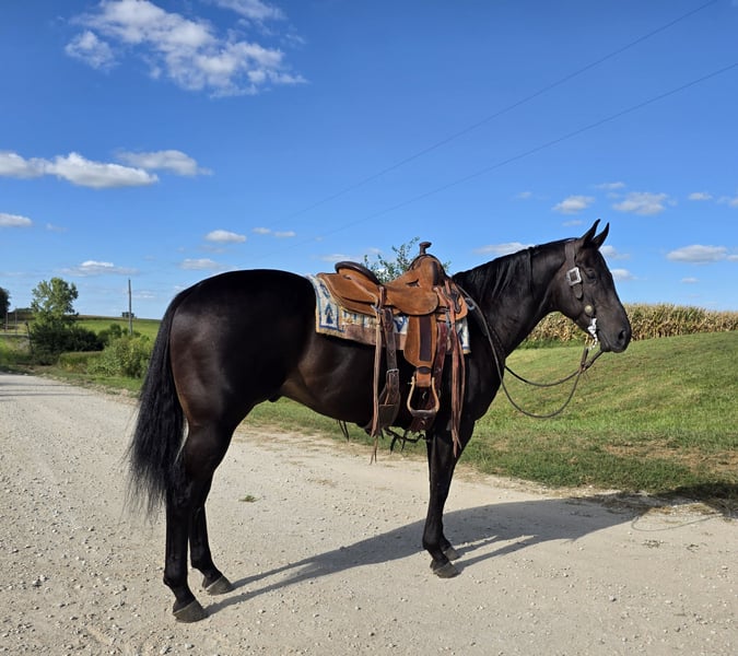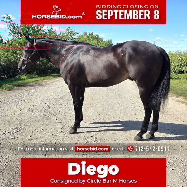 ♦️ 𝐭𝐡𝐞 𝐒𝐞𝐩𝐭𝐞𝐦𝐛𝐞𝐫 𝑺𝒆𝒍𝒆𝒄𝒕 ♦️ Happening now thru MONDAY | SEPTEMBER 8th - Available EXCLUSIVELY on HorseBid's website! For more details and to register visit: www.Horsebid.com CONSIGNOR CONTACT: Circle Bar M Horses 712-542-0911 LOCATION: Bedford, IA BREED: AQHA REGISTERED: Yes REGISTERED NAME: A True Patriot FMF COLOR: Black HEIGHT: 15.2 AGE: 4 GENDER: Gelding Diego is a sharp-looking, well-broke, and gentle gelding with the pedigree and mind to make a serious performance prospect. He rides great in the arena and out on the trails with no issues. He is good to handle, quiet, and kind natured. This gelding has the looks, brains, and breeding to go in any direction. Don’t miss the chance to put the finishing touches on a prospect with this kind of foundation and pedigree. Diego is a super gentle, people-loving gelding that’s 100% sound and rides off with no issues. He’s well broke, good-minded, and just as nice to be around on the ground as he is under saddle. Loves attention and enjoys having a job. Diego has been used to pony colts and check pastures. Just a really nice horse to have in the barn or take out for a ride.