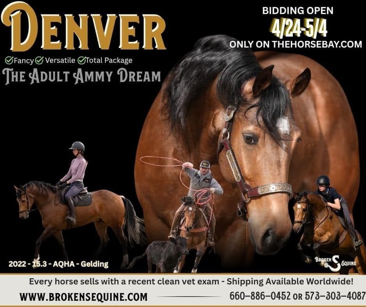 Denver is a true jack of all trades. He is the kind of guy that will do absolutely anything and do it like he’s done it his whole life. Everything he does, he does well, safely, and with so much style. He is like a mullet. You’ve heard “Business in the front and party in the back”, right? Well, Denver is business in the tack and goofball in the stall. This horse has the absolute best, silly goose, always making us laugh personality I’ve ever seen in a horse. You spend 30 seconds with him in the barn, and you won’t imagine your life without him. He is the complete package, and is a testament of what a good, versatile upbringing turns a horse into. Rope with him, ranch with him, take him to a dressage show, event, hit the trails, or just enjoy his personality on the ground, anything you choose to do he will happily do with you. Denver is a registered 2022 Quarter Horse gelding standing 15.2/3 hands tall. Horses like Denver are hard to find. He not only seamlessly crosses over between the western and English disciplines, but he has the real talent and movement to succeed up the levels in any show pen or arena too. His brain is the best. He handles new places, situations, and spooky things like a professional. He has the tools and flash for a pro to get the most from, yet he is tolerant and safe for the amateur to partner with and enjoy for years to come. Whether your plan is to find a horse you can safely grow with, a show parter, a friend to bond and trail ride with, or do all of the above — Denver is your man. Under western tack, Denver has all the buttons installed and the versatility to cross over wherever you point him. He circles well, has a nice turnaround, stop, and transitions. He lopes off from a standstill and has great lateral work. He has been started on both the head and heel side and has been used to pasture rope calves. He is fun to sort on and is easy to get along with. Under English tack, Denver has three quality gaits, is soft in the bridle, and is ready to step into the dressage ring. He has great lateral work, and listens well to leg, seat, and hand cues. He is the right mix of whoa and go, is very adjustable, and enjoys his job. Over fences, Denver is brave and scopey. He is putting together small courses in the ring and has seen all types of fences on the cross country field. On the trails, Denver loves to explore. He will hop into water, crossroads with traffic, and will go wherever you point him. He is fine riding in a group or alone and is easy to load up and go new places. We have taken him off property to school, lesson, hunter pace, and trail ride. He hops on and off the trailer easily and is ready to do whatever is asked of him that day. In the barn is where Denver will steal your heart. I don’t know if I have ever had a horse that is just so funny to be around. Most horses would shy from tarps, bouncy balls, or other spooky objects when they are loose in the arena, but Denver makes it his mission to play with and toss around anything he can find. He will jump over any set jumps just for fun, and if you toss him the ball, he'll play with you for hours with it. He is a good boy when stalled, and he will have his head out trying to play with your hair, untie knots, and try to be the center attention if he can manage it. He is happy in turnout and gets along well with mares and geldings in the field. He is, not surprisingly, the first to the gate when it’s time to come in, and would probably prefer to live in the house with you if he had the option. ⚫️Denver is an easy keeper that requires no maintenance.