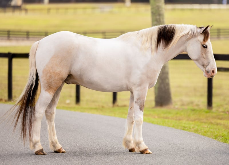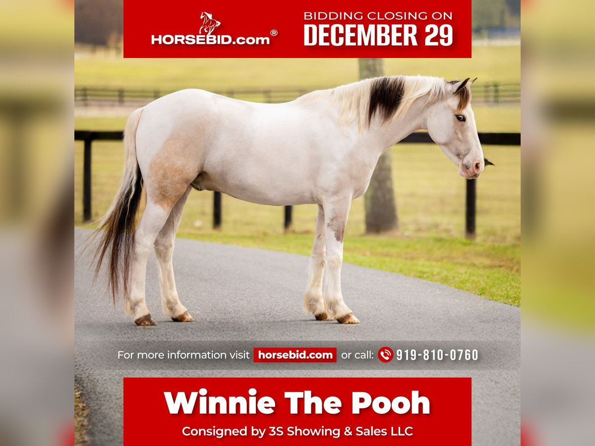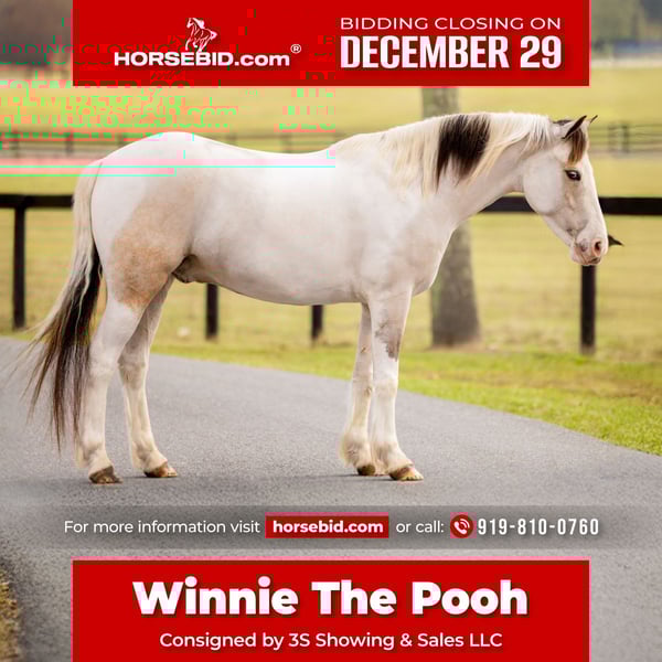 ⚜️𝐓𝐇𝐄 𝓗𝓮𝓻𝓲𝓽𝓪𝓰𝓮 𝐖𝐢𝐧𝐭𝐞𝐫 𝓒𝓵𝓪𝓼𝓼𝓲𝓬⚜️ Happening now thru MONDAY | DECEMBER 29th - Available EXCLUSIVELY on HorseBid's website! For more details and to register visit: www.Horsebid.com CONSIGNOR CONTACT: 3S Showing & Sales LLC 919-810-0760 LOCATION: Ocala, FL BREED: QH/Welsh/Gypsy REGISTERED: No COLOR: Buckskin Paint HEIGHT: 13.2 AGE: 4 GENDER: Gelding Winnie the Pooh, aka “Popcorn,” has passed all the kid-safe tests… and then some! We’ve always called him Popcorn, but Paisley officially overruled us last month and renamed him Winnie the Pooh. So now, Popcorn is officially just his nickname—according to Paisley. The verdict is final. No appeals. She definitely won this one! Names aside, Winnie the Pooh is the kind of pony every rider dreams of. Despite his young age (coming 4 years old) in 2026, he has been exposed to more experiences than many senior ponies see in a lifetime. With the perfect size and build for both children and adults, he is an incredibly versatile, confidence-building partner. He has been ridden by the tiniest children and remains completely unflappable—absolutely zero spook and as safe as they come. From being fully covered in a shaking tarp, to jumping (both cross country and in the arena) to even jumping into the back of a Pick Up truck, Winnie The Poo takes everything in stride. He rides confidently down the road, teaches lessons, drives quietly in a carriage, and has even come into our house. We regularly ride him through town, and he has even gone shopping inside farm supply stores with us. There truly isn’t much this superstar pony hasn’t seen or done. Heck, even the dog has ridden him! The only thing he cant do is drive the Truck Himself! Winnie The Poo has some of the best ground manners you will find. He is kind, personable, and extremely respectful of personal space. He loves attention and being doted on by children, making him the ultimate babysitter and nanny pony. He has been ridden bareback in just a halter—or even only a neck rope—by many children, consistently taking excellent care of his riders. Paisley our smallest rider( 8 years old), loves riding this sweet pony and confidently trots him all around the farm. She is able to catch him from the field, tack up, and ride him entirely on her own without assistance, which speaks volumes about his reliability and temperament. Winnie The Poo has the kindest eyes and the sweetest soul. He is the type of pony you can trust without hesitation. If you are looking for a pony that will happily and safely pack your kids around in any setting, this is your boy. Simply put, this is the kind of pony we trust our own children on—no matter the situation. I could truly write a book about how special this pony is, but we’ll let the video speak for itself! No vices. No holes. Winnie the Pooh—aka Popcorn—is the kind everyone searches for—and the kind that rarely comes available.
