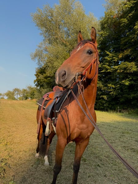 HS Kiss My Boon - ein im April 2020 geborener Quarter Horse Wallach in der Farbe Bay mit einem Stockmaß von ca. 145 cm. Er ist bildhübsch, korrekt gebaut, gut bemuskelt und zeigt sich als robuster, unempfindlicher Partner, der barhuf läuft und regelmäßig geimpft sowie entwurmt wurde. Im Umgang ist Ferry ausgesprochen freundlich, menschenbezogen und verschmust. Er ist verspielt, neugierig, aufmerksam und zeigt sich stets interessiert an seiner Umgebung. Dabei ist der Wallach nicht dominant und versteht sich gut mit anderen Pferden, egal ob in der Box, im Aktivstall oder in der Herde. Aufgrund seiner Intelligenz benötigt er jedoch auch geistige Auslastung und sucht einen Menschen, der ihn fördert und fordert. Ferry wurde mit viel Ruhe und Bedacht angeritten und besitzt eine solide Westerngrundausbildung. Er ist geländesicher und kennt auch die Arbeit mit Stangen. In seiner Entwicklung zeigt er sich als Spätzünder, aber mit einer sehr guten Lernbereitschaft. Ferry ist aufgrund seines Alters kein reines Anfängerpferd und sollte daher von einem erfahrenen Reiter weiter ausgebildet oder gefördert werden. Der Wallach sucht ein neues Zuhause als treuer Freizeitbegleiter. HS Kiss My Boon ist ein tolles Pferd mit großem Herzen, das sich einen Menschen wünscht, der ihn mit Geduld, Verständnis und Herz begleitet.