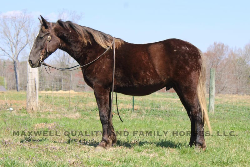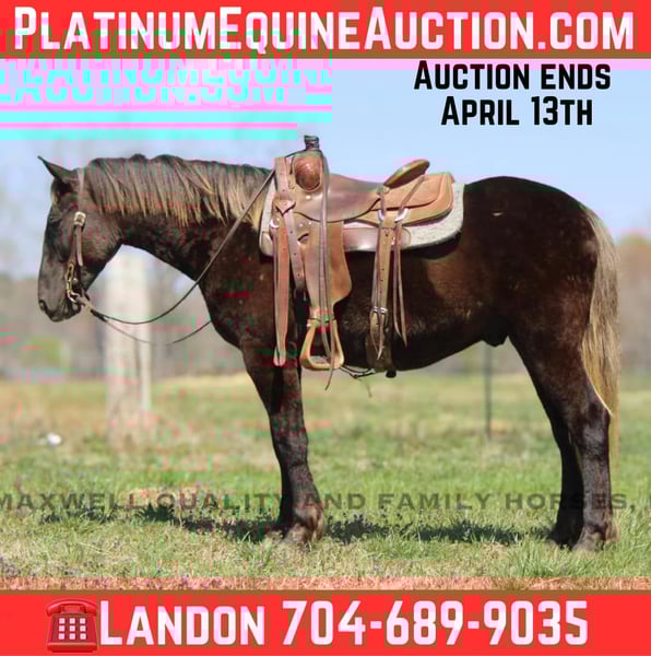 ONLINE AUCTION Place your bids at www.PlatinumEquineAuction.com Starting Bid $3500 Auction ends April 13th, 2025 Need a new saddle? Check out White Rock Saddles on our website or Facebook! Sammy is a 4yr old 14.3h Friesian/Quarter horse cross gelding! Sammy is a very unique Chocolate color with a flaxen mane and tail. He is stocky and built to last. Sammy has a great personality that anyone would love and he is always the first one to greet you in the pasture! He has a very solid wtc that anyone could sit. He takes his leads and lopes nice cirlces. We have taken him on trail rides in the mountains where he will cross anything that you ask from deadfall to creeks to ditches, steep slopes don’t bother him either and also done tons of riding along the side the highway. He will ride Western or English and would be a great horse to go over the rails! Here is a super safe and calm minded gelding!! He is 100% Safe and Sound! We are located in Cherryville, NC if you would like to schedule an appointment to come see him and we can set up delivery anywhere in the US! If you have any questions, would like to facetime call or come see Sammy in person Call or Text Landon with Maxwell Family Trail Horses 704-689-9035. ONLINE AUCTION Place your bids at www.PlatinumEquineAuction.com Starting Bid $3500 Auction ends April 13th, 2025 Need a new saddle? Check out White Rock Saddles on our website or Facebook!