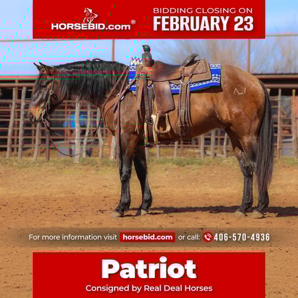 💎 𝐓𝐇𝐄 𝓓𝓲𝓪𝓶𝓸𝓷𝓭 𝐒𝐇𝐎𝐖𝐂𝐀𝐒𝐄 💎 Happening now thru MONDAY | FEBRUARY 23rd - Available EXCLUSIVELY on HorseBid's website! For more details and to register visit: www.Horsebid.com CONSIGNOR CONTACT: Real Deal Horses 406-570-4936 LOCATION: Ripley, OK BREED: Quarter Horse REGISTERED: No REGISTERED NAME: Patriot COLOR: Grulla HEIGHT: 14.3 AGE: 5 GENDER: Gelding If this gelding doesn’t turn your head, I’m not sure what will! Patriot has big foot and bone, a heart the size of Texas, and a big, dramatic dorsal stripe that only adds to his already eye-catching look. He has all the shape you want and then some. Patriot is not only impressive to look at, but equally enjoyable to ride. He has been used for day work, has experience at the cattle sales, and has been started on the heel-o-matic. He is the ideal age for someone wanting a horse with a solid foundation and a willing mind that is ready to continue in any direction. He is intelligent, eager to learn, and retains what he is taught. He has been hauled to numerous trails and enjoys getting out and seeing new country. He confidently crosses water, logs, and all types of obstacles. Patriot is one hand broke, will really collect up nicely when asked, and shows the desire to be a big stopper. He side passes to open and shut gates, has clean lead departures, and lopes nice circles. Patriot is not finished in any one discipline, but he is a versatile gelding with the ability to go on and specialize. He is a true jack of all trades type who is ready to continue in the arena, on the ranch, down the trail, or wherever someone wants to take him. He aims to please, carries himself with class, and has all the makings of a high quality using and performance horse. He’s great for the farrier, stands quiet to be saddled and mounted, gets along well with pasture mates, and is clean and quiet in a stall.