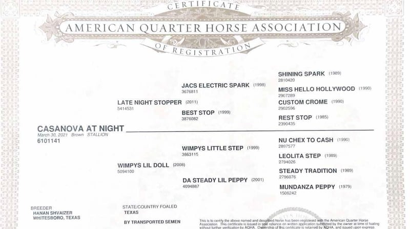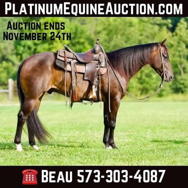 ONLINE AUCTION Place your bids at www.PlatinumEquineAuction.com Starting Bid $3500 Auction ends November 24th, 2024 Need a new saddle? Check out White Rock Saddles on our website or Facebook! Casanova At Night Affectionately known as “Romeo ” is an exceptional coming 4-year-old AQHA gelding. His pedigree speaks for itself. As he is an OWN SON of the great sire Late Night stopper LTE $101,678 and a by a money earning daughter of Wimpys LIl Step! Romeo stands 15 hands tall and has right at 11 months worth of reining training under his belt. He is smooth and moves fluent in every maneuver! He’s a big stopper, beautiful circles, powerful spins and easy lead changes. This is a fun gelding who stays trained with time off! He rides outside the same as in the arena! He rides quiet and gentle through the woods, along the highway, and through fields and ditches. Romeo also has dabbled in some other events and is showing huge promise!! He has the training and the mind to make an amazing ranch riding/ ranch versatility gelding and will definitely take you to the pay window!! He also has been lightly started in the dressage arena and is showing huge promise in that also! Romeo is a unique gelding that can’t be duplicated if we tried with his pedigree, shape, and training! You wont find one like him, don’t miss out! For more info please call or text Broken S Equine Beau 573-303-4087 Located in Sweet Springs, MO. ONLINE AUCTION Place your bids at www.PlatinumEquineAuction.com Starting Bid $3500 Auction ends November 24th, 2024 Need a new saddle? Check out White Rock Saddles on our website or Facebook!