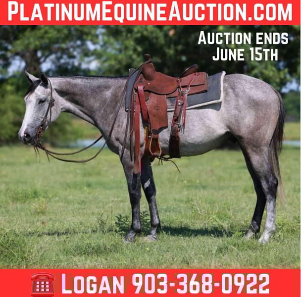 ONLINE AUCTION Place your bids at www.PlatinumEquineAuction.com Starting Bid $3500 Auction ends June 15th, 2025 Need a new saddle? Check out White Rock Saddles on our website or Facebook! Chase is a 4 year old grey gelding that stands 15 hands and is built correct this young gelding is a ranch favorite. Chase is the type of gelding you go catch him knock the dirt off his back and go to work this gelding has a good one hand neck reign handle and is very soft in the face. We have used chase for just about anything and everything on the ranch from doctoring cattle to just simply checking fences he will go all day stay low headed and calm and let you do a days work with ease. The thing we like most about this young gelding is not only can you go use him all day on the ranch but if you want to ride through the trails or down the road with your friends he’s not going to spook or dart off not only does this gelding have a great mind but has the color to match don’t miss him! For any more info please call X5 Ranch Logan 903-368-0922 Located in Canton, TX. ONLINE AUCTION Place your bids at www.PlatinumEquineAuction.com Starting Bid $3500 Auction ends June 15th, 2025 Need a new saddle? Check out White Rock Saddles on our website or Facebook!